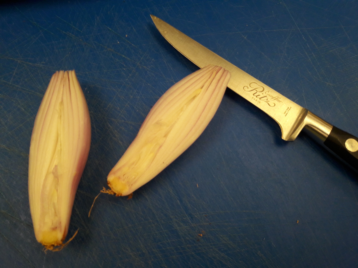 Epluchage et ciselage des échalotes (truc : garder la racine et couper dans le sens de la longueur ; ce n’est qu’à la fin que l’échalote – ainsi conservée entière – peut se hacher très finement), des pommes de terre en navettes à 7 faces, des champignons de Paris « bouton ».