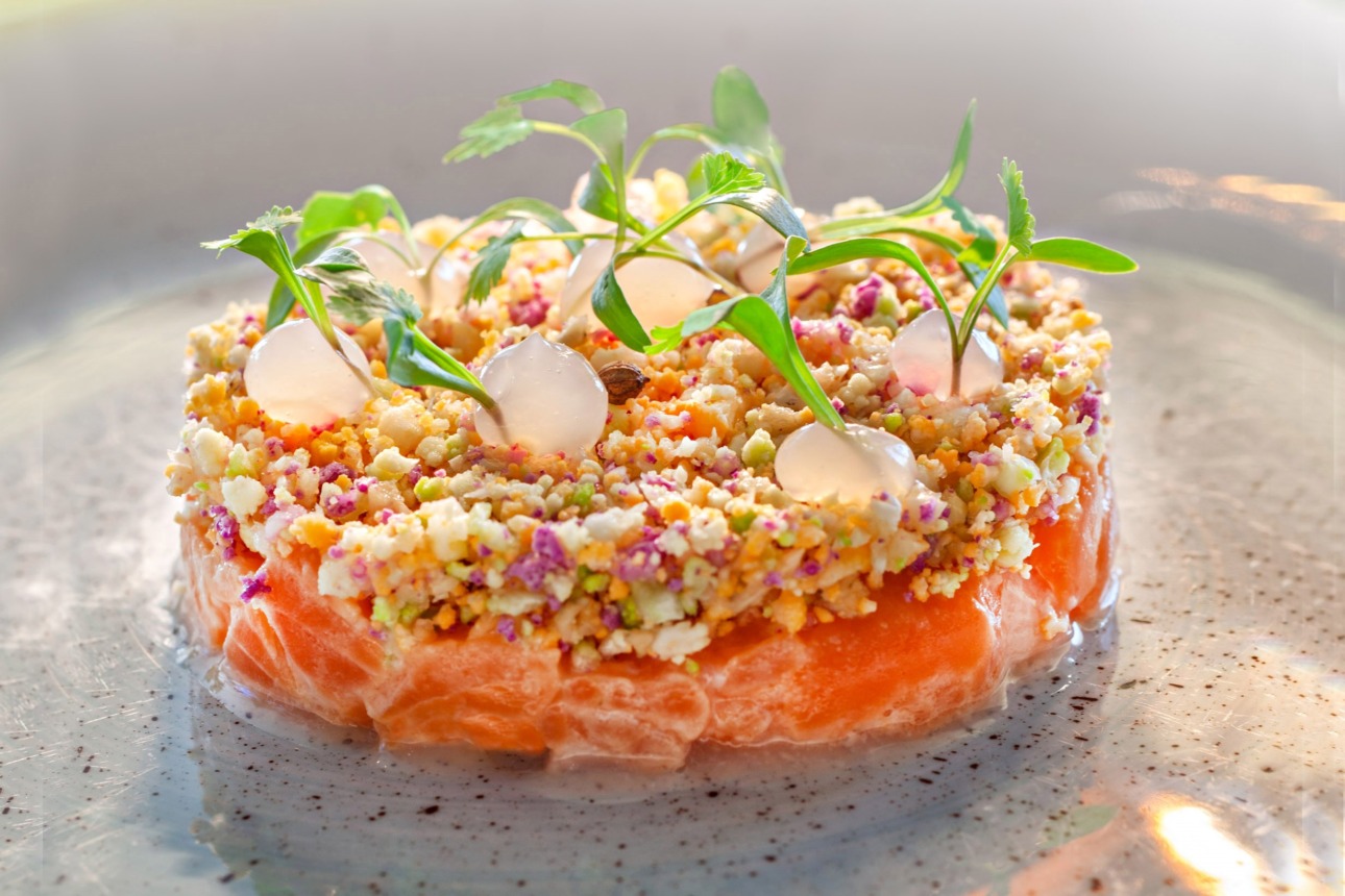 L’Hôtel cinq étoiles Negresco, dernier palace indépendant de la Côte d’Azur, s’inscrit pleinement dans son temps. Sa cheffe Virginie Basselot (deuxième femme à obtenir le titre de Meilleur Ouvrier de France en cuisine-gastronomie) et son sommelier Robin Salvadori cultivent la relation avec les producteurs et vignerons, pour des propositions inventives et sincères. Pour les trois recettes « classiques et audacieuses » de la cheffe accordée au n°81 de Terre de vins, il a choisi des vins sains, fruits de belles rencontres, formant des accords plein d’humanité. Voici la recette du Ceviche de truite du Cians, semoule de chou-fleur multicolore et condiment citron-orgeat.