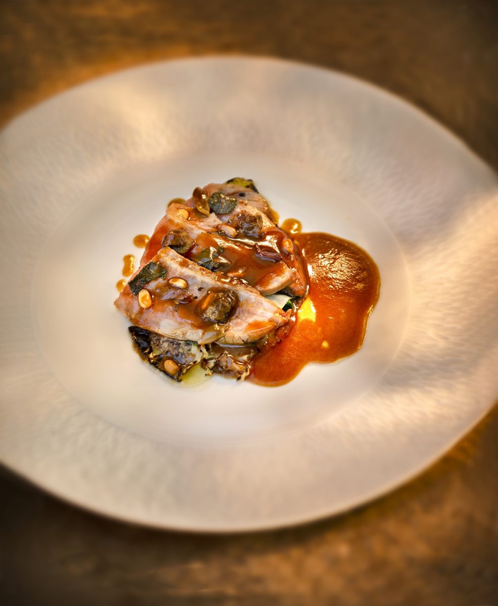 Sortir le veau 3 heures avant le début de sa cuisson, l’assaisonner de sel, colorer à l’huile d’olive de toutes ses faces, ajouter du beurre, 5 g de poivre mignonnette, les aromates de la marinade. Cuire 8/10 minutes dans un four à 135° en l’arrosant toutes les deux minutes. Sortir et laisser reposer. Au moment de servir, le tailler en fines tranches et faire légèrement chauffer dans son gras de cuisson, avec le jus de veau, 30 g d’olives noires taillées en aiguillettes, 30 g de citron confît au sel en petite brunoise et la sauge. Dresser dans le fond de l’assiette la purée d’échalote, les épinards au beurre et la feuille de chou grillée, finir avec le veau au jus et quelques câpres frits.