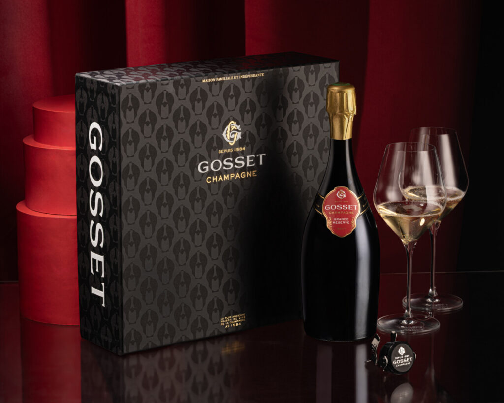 À Aÿ, la maison de Champagne Gosset fondée en 1584, signe un coffret à son image : élégant, intemporel et pensé pour le partage. Le Coffret Gosset Grande Réserve réunit une bouteille de Grande Réserve, deux verres à dégustation et un bouchon stoppeur adapté à la forme singulière des flacons de la maison. Fabriqué à la main à Épernay, cet écrin réutilisable et éco-conçu incarne l’élégance sobre chère à Gosset. À l’intérieur, la cuvée Grande Réserve illustre tout le style de la maison : un assemblage de Pinot Noir (45 %), Chardonnay (35 %) et Meunier (20 %), élevé plus de quatre ans en cave, qui marie fraîcheur, structure et complexité aromatique. Un champagne à savourer de l’apéritif à la table, parfait pour accompagner une volaille crémée, un comté affiné ou un simple moment de fête.