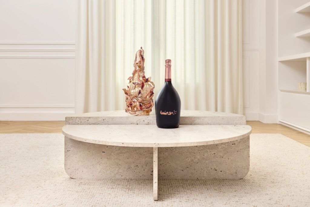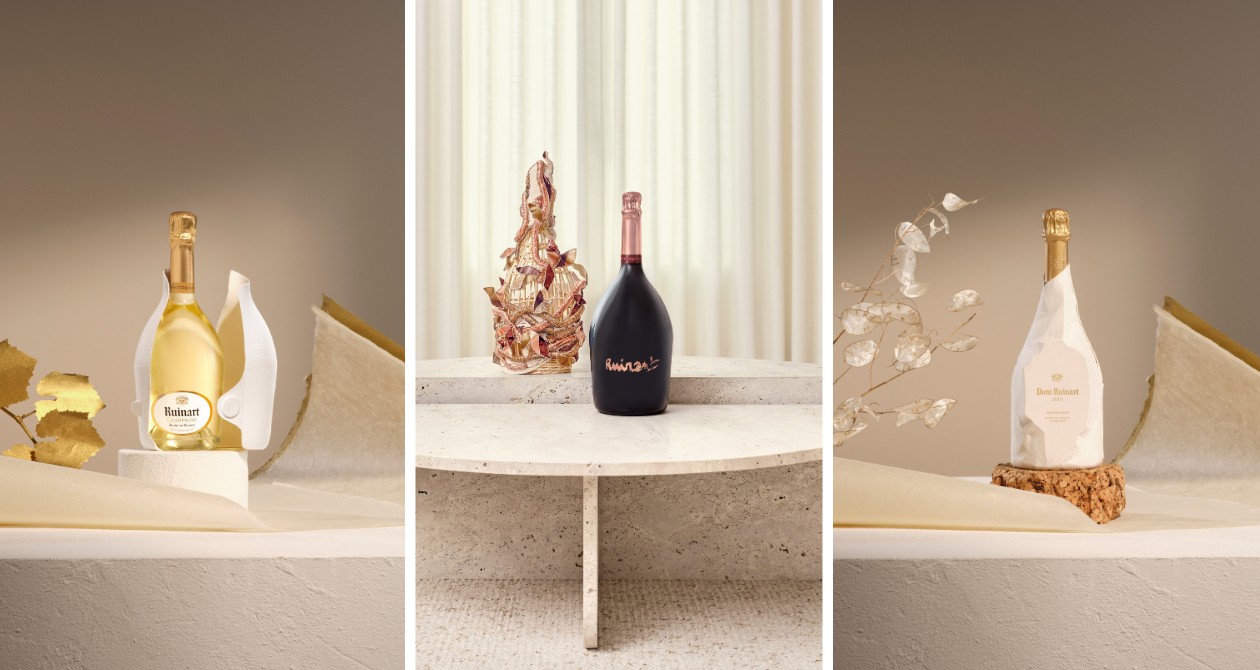 Au sein du Ruinart Studio, laboratoire de création initié par la Maison en 2021, la brodeuse Marie Berthouloux signe trois pièces sur-mesure habillant des jéroboams de Ruinart Rosé. Inspirée par le vignoble champenois, elle a brodé en relief les rangs de vignes et les feuilles de chardonnay, à partir de matières issues du champagne Ruinart : fil doré des muselets, lie de vin et doré vieilli des coiffes. Façonnées à la main avec la tapissière Anaïs Jarnoux et la vannière Marie Drouet, ces créations d'orfèvrerie textile ont nécessité près de 320 heures de travail. Cet upcycling réunissant démarches responsables et artistiques rend hommage à l'esprit visionnaire de Ruinart, qui en 1764, fut la première Maison de champagne à commercialiser un rosé.