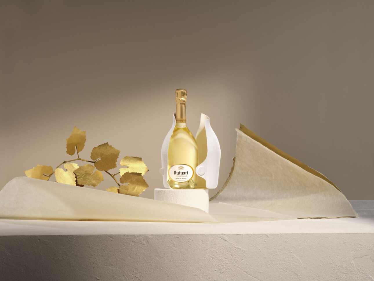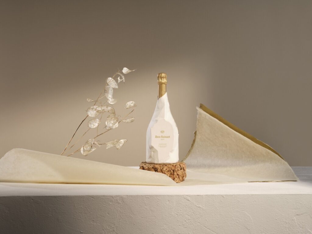 Présenté dans son étui « Crayères », éco-conçu en papier texturé et recyclable, il évoque le lien profond entre la cuvée Dom Ruinart et la roche crayeuse, depuis la vigne jusqu'au vieillissement dans les caves historiques de Reims.