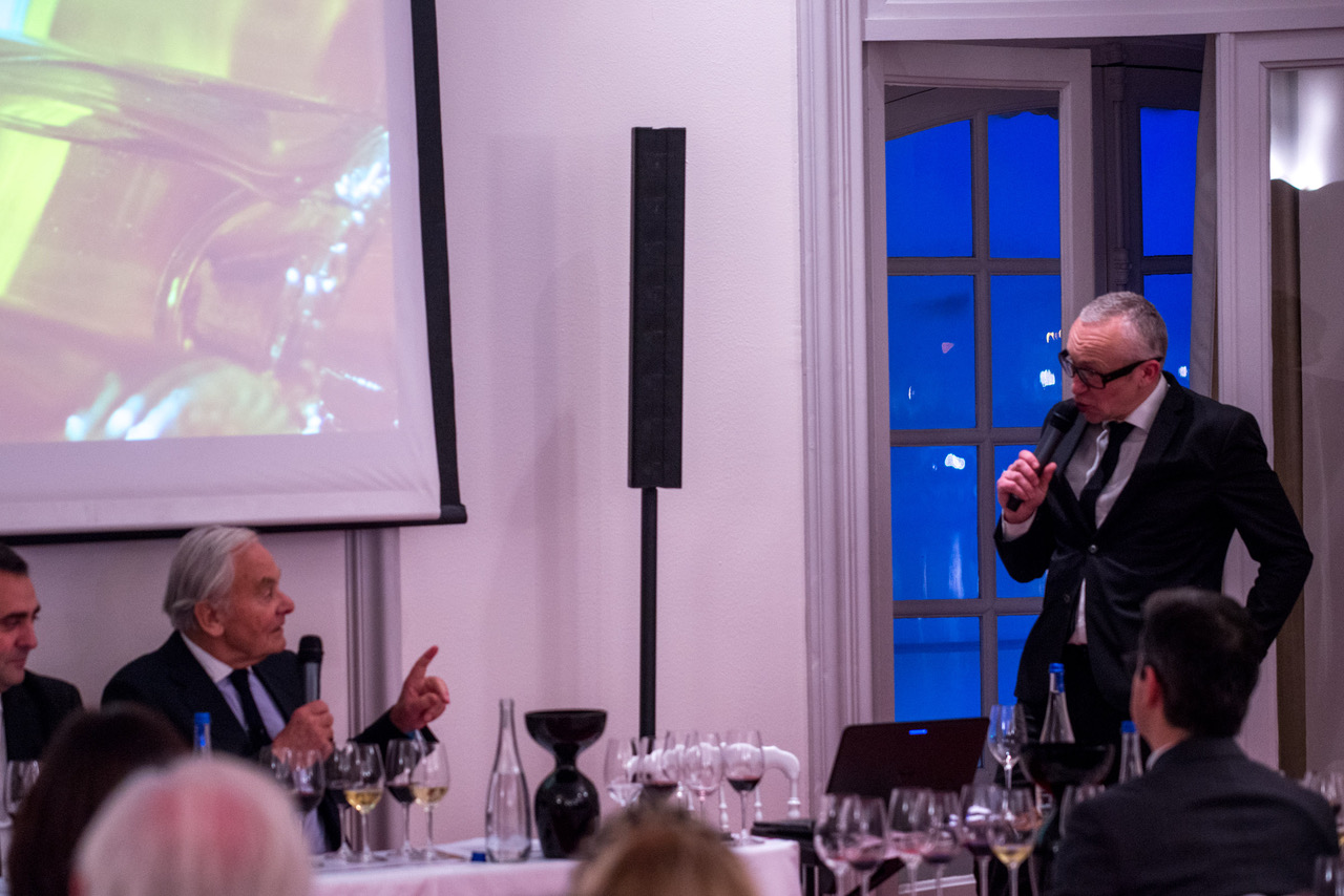 Salle comble pour la master class de haut-vol dédiée à Bernard Magrez ce samedi à 16h dans l’écrin du Palais de la Bourse, avec un auditoire attentif et captivé. En dégustation : deux vins blancs secs (châteaux Magrez-Fombrauge 2014 et château Pape Clément 2007), trois vins rouges (château Pape Clément 2010, château Fombrauge 2011, château La Tour Carnet 2009) et un sauternes (Clos Haut Peyraguey 2014). « Bernard Magrez, c’est une rock-star ! Tout le monde lui fait signer des autographes en bas » annonçait en ouverture de la master class dédiée à « l’homme aux 40 vignobles » Rodolphe Wartel, le directeur de Terre de Vins. Bernard Magrez n’aura d’ailleurs pas manqué de rejoindre en fin de master class ses trois directeurs de propriétés réunis pour l’occasion, et de se prêter au jeu des questions-réponses.