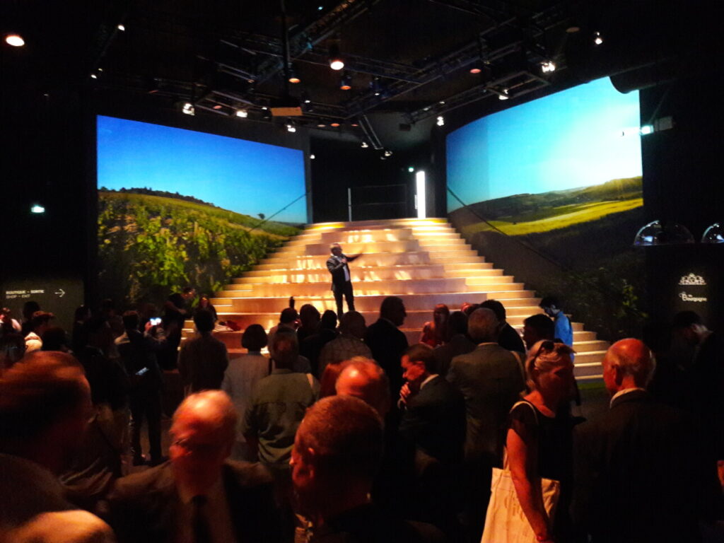 Une fois entré dans les lieux, on accède à la billetterie, puis à la scénographie. Pour la première fois révélé ce jour, ce parcours de visite a dévoilé ses grands espaces, ses matières brutes, et surtout son l'atmosphère sombre, fraiche et intimiste. De quoi rappeler les plus belles caves de Bourgogne.