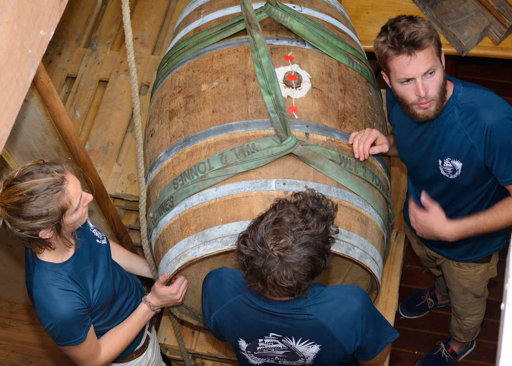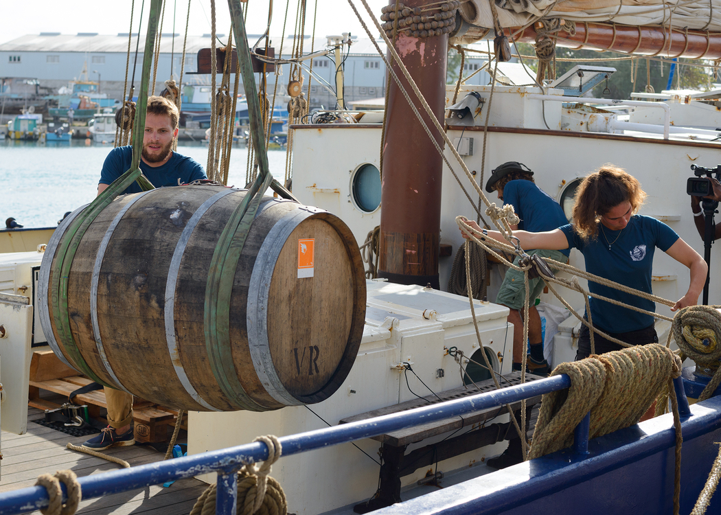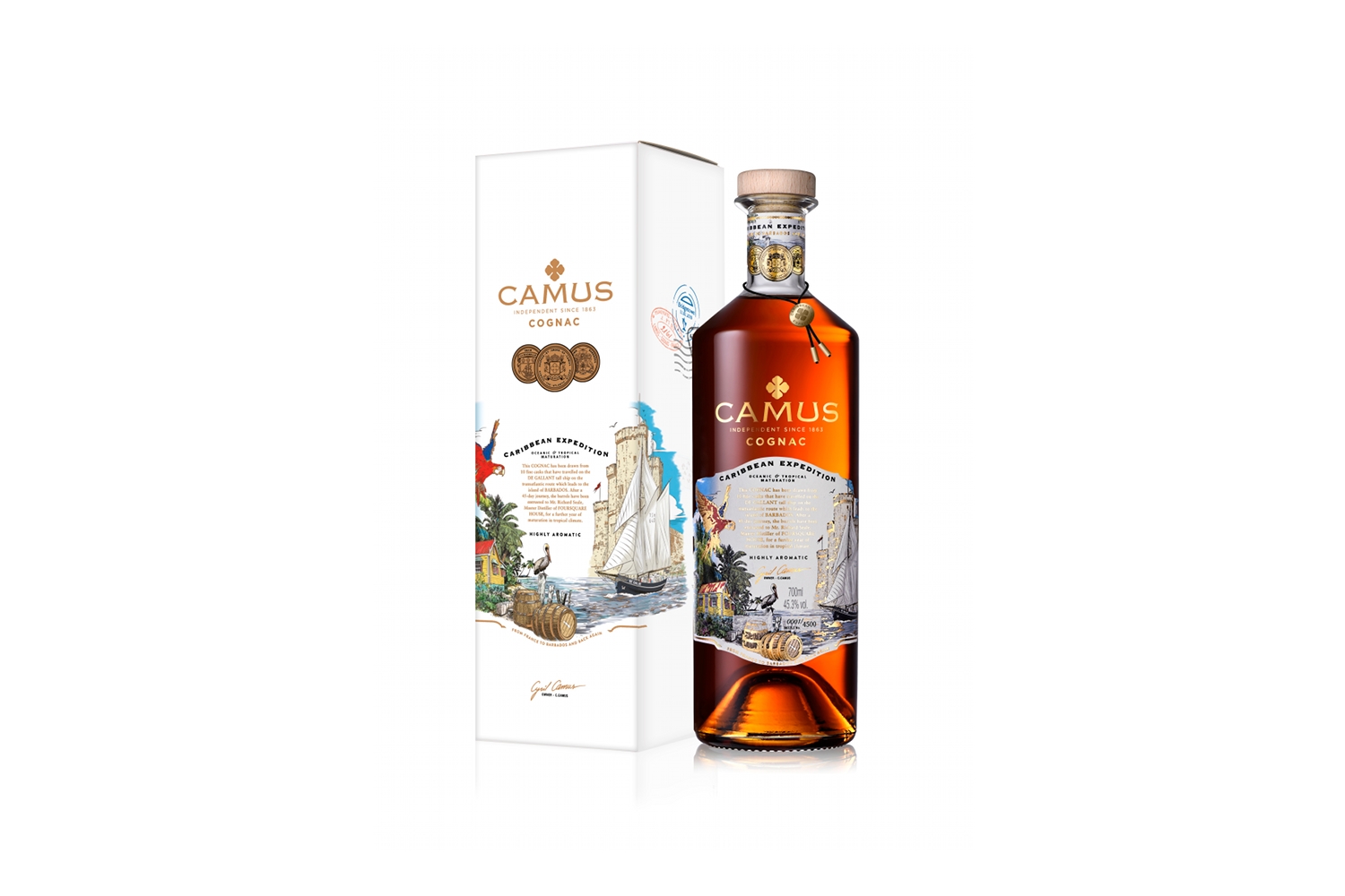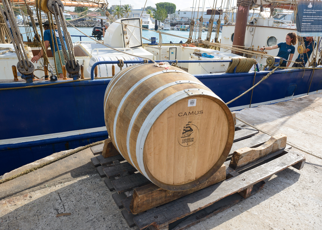 L’étiquette est digne des plus belles chasses aux trésors nous renvoyant volontiers au célèbre roman de Robert Louis Stevenson. Dans la bouteille repose un cognac qui a subi une double maturation océanique et tropicale, comme autrefois lorsque les eaux-de-vie voyageaient par bateau pour arriver à bon port – ou pas. C’est dans cet esprit que la maison Camus a chargé 10 fûts scellés sur un grand voilier pour traverser l’Atlantique jusqu’à l’île de la Barbade dans les Caraïbes. Un périple de 45 jours pour que les fûts débarquent à Bridgetown où le maître-distillateur, Richard Seale, de la maison de rhum Foursquare, les prenne en main pour un an. Le magnifique voilier De Gallant est parti du port charentais-maritime de La Rochelle le 23 novembre 2018 : les alizés étaient favorables. Après quelques déconvenues maritimes et une escale à Tenerife, l’équipage est donc arrivé dans les Caraïbes.