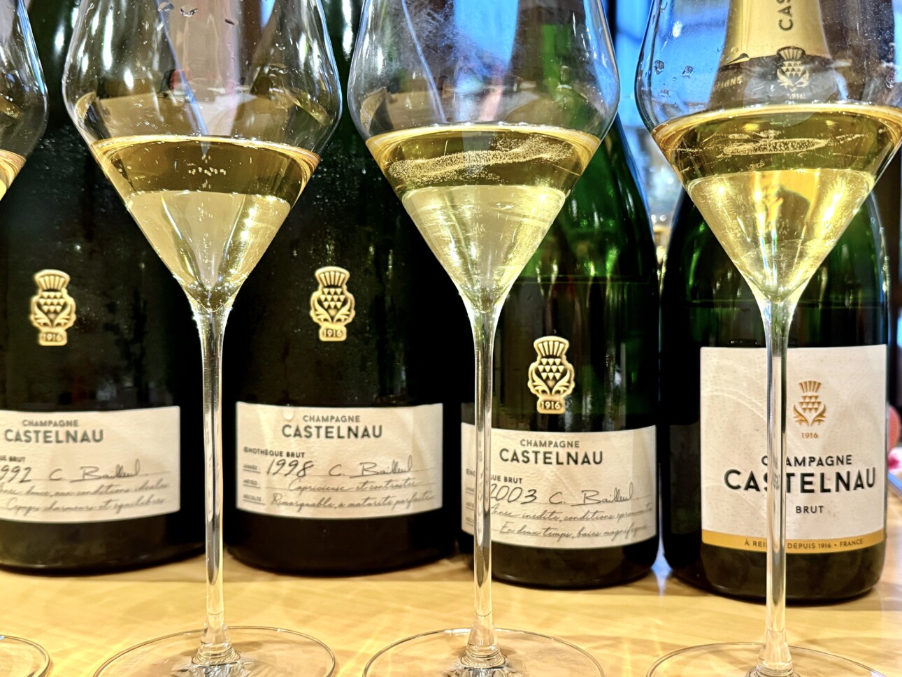 Pour Carine Bailleul, le millésime 2003, année chaude par excellence, a été une leçon fondatrice : la maturité des raisins et les polyphénols ont influencé directement la capacité de garde. Face à l’impact du changement climatique, elle défend une adaptation fine : vendanges plus précoces, dosages bas, introduction progressive de vins sans fermentation malolactique pour préserver la fraîcheur, tout en travaillant en collaboration constante avec la recherche. Le collectif est au cœur de la démarche Castelnau. Cette vision trouve également son aboutissement dans l'Œnothèque, mémoire vivante de la maison. Castelnau a conservé des vins de presque toutes les vendanges depuis 1961, y compris ceux non millésimés. Conservées sur pointe, non dégorgées, ces bouteilles sont pilotées par la perméabilité des capsules et dégorgées tardivement, à la demande, afin « d'encapsuler le temps ».