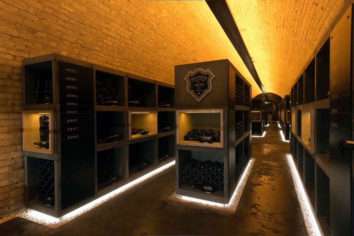 La première œnothèque est baptisée « Galerie 1829 » (Bollinger a été créé en 1829). Elle compte toutes les bouteilles anciennes trouvées en plusieurs lieux du dédale souterrain d’Aÿ, mais aussi dans la cave personnelle de la famille. Ce trésor rassemble notamment la collection des R.D. depuis leur création en 1952 ; tous les millésimes des Vieilles Vignes Françaises depuis 1969 et la collection de vins rouges. Décorée avec un luxe sobre et éclairée à la lumière tamisée LED, elle remonte le temps derrière une grille forgée jusqu’à un puits dans la craie qui abrite les plus anciens flacons, antérieurs à 1852. Température, hygrométrie, luminosité : tout est contrôlé dans les moindres détails !