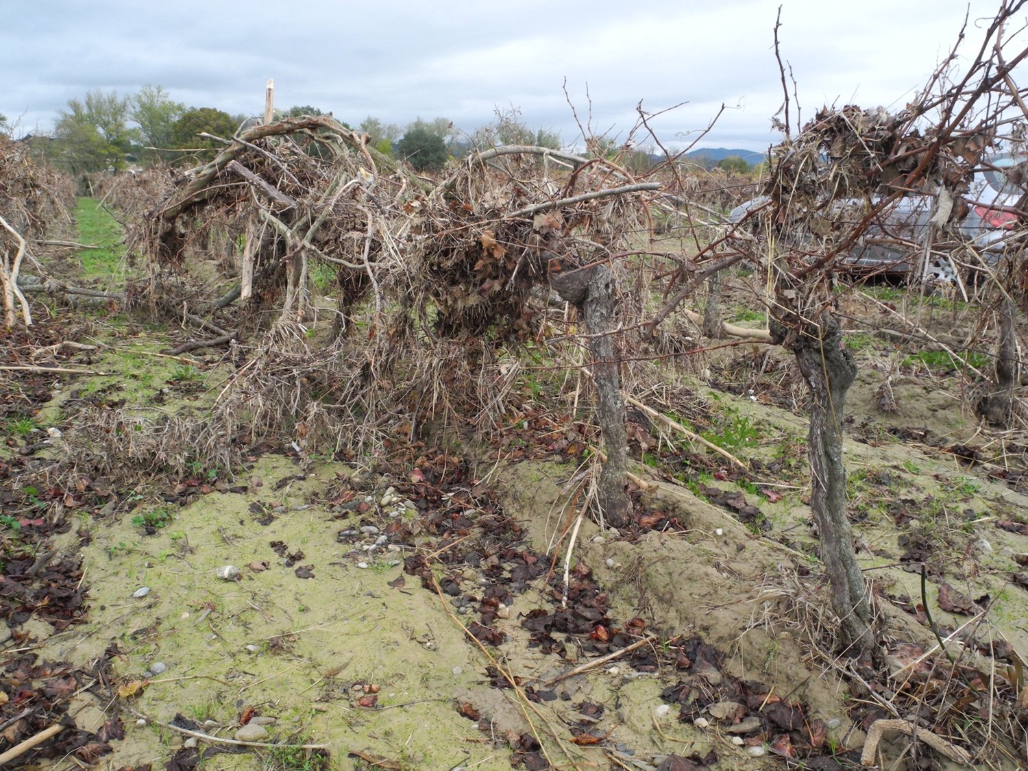 Les travaux ce lundi 26 novembre, mobilisaient une dizaine d’hommes et de femmes chez Jacques Roger, vigneron indépendant touché sur trois hectares ; ou 34 autres personnes chez Marie-Christine Guilhem du domaine de Couffoulens. « Il y a des ceps de vigne à redresser, des espaliers couchés, des souches qui ont ployé face à la puissance du débit », détaille cette vigneronne touchée sur 7 hectares de son exploitation qui en compte 70. Mais si les vignes de ces deux domaines pourront pour l’essentiel être sauvées, ce n’est pas le cas de tous les vignerons. « Sur certaines parcelles, la terre est partie pour ne laisser que des gravières », déplore Pierre Lacube. Alors que les expertises sont encore en cours, les dégâts ont été évalués selon une échelle de valeur de 1 à 5, le plus haut degré de sinistre se portant sur ces terres désormais incultes, impropres à toute forme de culture.