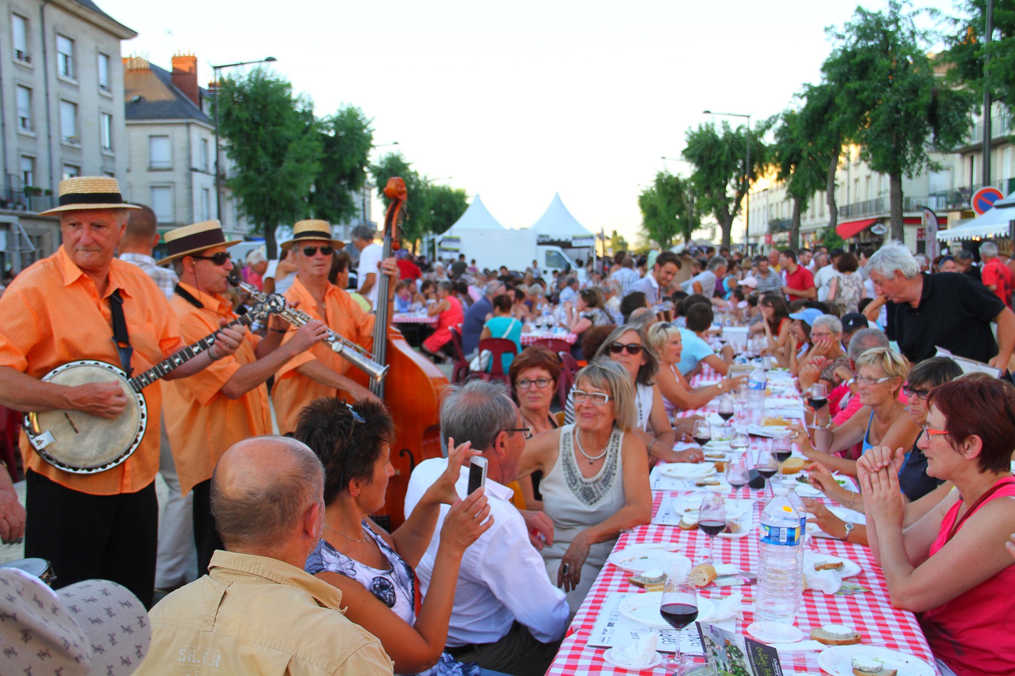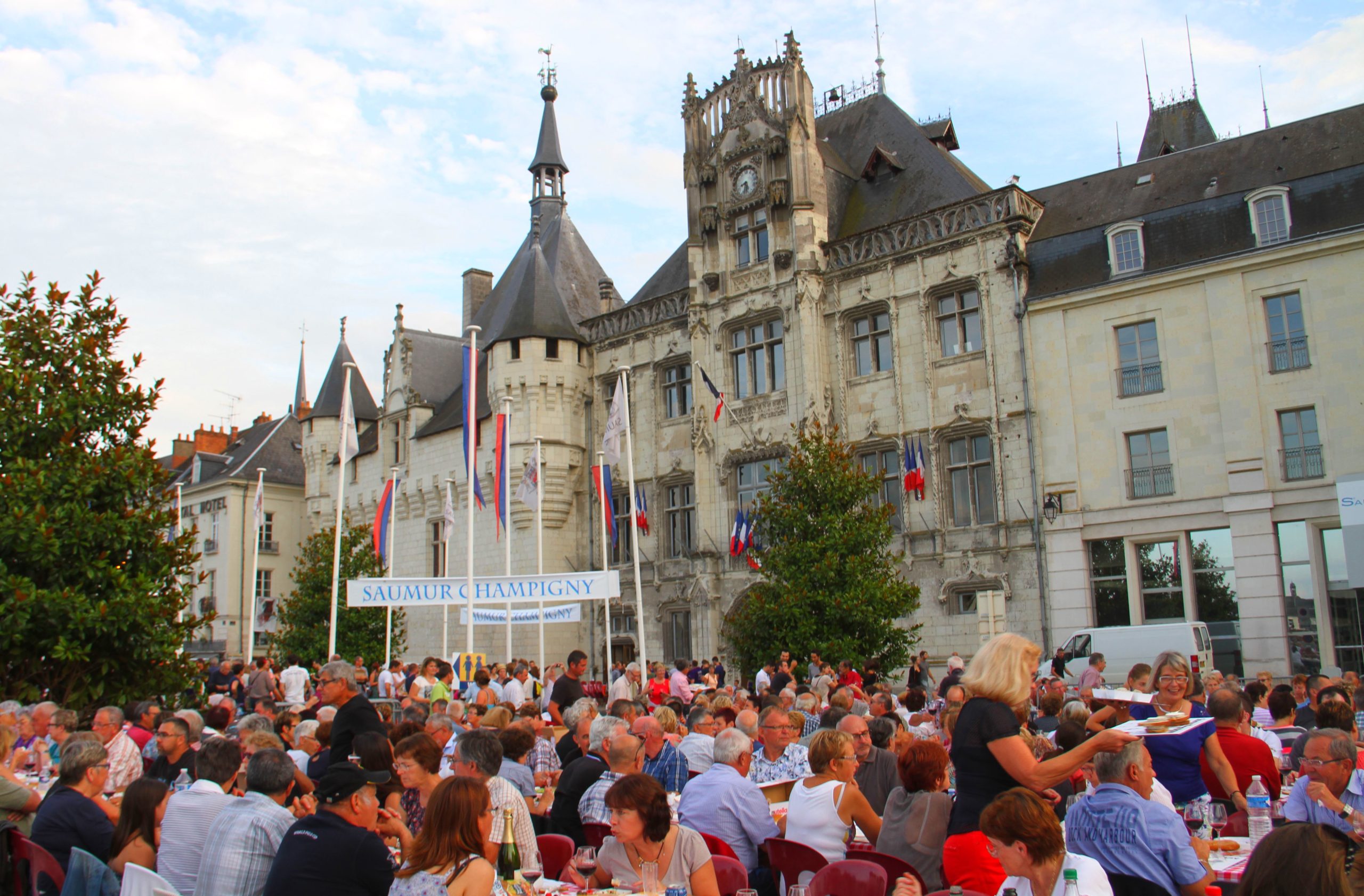Chaque été, Saumur sort les tables, les lampions, la musique et les bouteilles de vin pour ses Grandes Tablées. Classique, sauf que là-bas, quand ils disent « Grandes », ce n’est pas pour rigoler : 2km de tables sont installées devant l’hôtel de ville, pour pouvoir accueillir deux fois 3000 convives, auxquels s’ajoutent 4000 badauds…