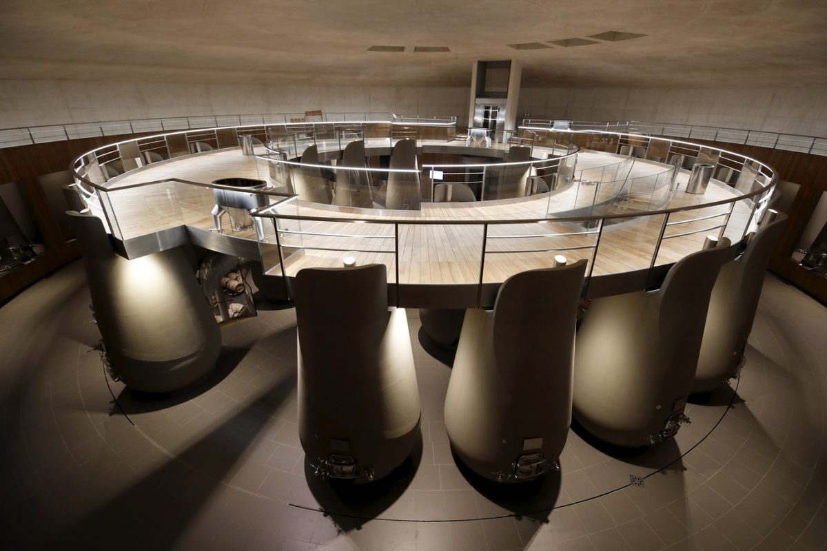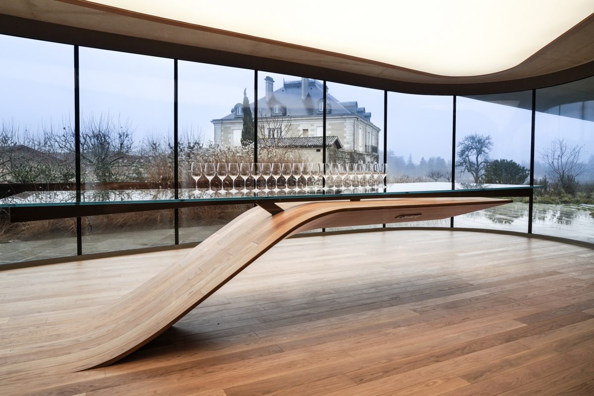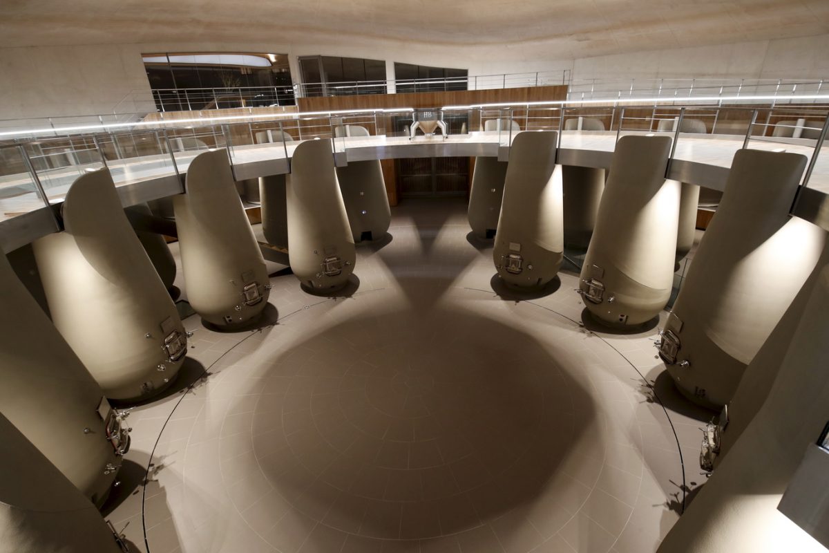 Zen, le mot est lancé : tout ici concourt à véhiculer un sentiment de sérénité, de fluidité, d’harmonie. Le choix des matières, nobles et épurées – béton, bois, verre, acier – sans être aseptisées. La circulation facilitée, aussi bien pour les membres de l’équipe qui apportent la vendange, travaillent au cuvier ou au chai, que pour les visiteurs qui viendront découvrir ces installations (actuellement près de 8000 personnes par an). La prouesse architecturale et technique, entre la voûte circulaire de 38 mètres de diamètre soutenue sans aucun pilier et incluant un puits de jour, les 54 cuves gravitaires en inox et béton qui font le tour du bâtiment pour un grand confort de travail au plus près du parcellaire, le chai circulaire lui aussi pouvant accueillir plus de 900 barriques, le contrôle de l’ensemble des opérations et consommations d’eau et énergie par écran tactile. Et surtout cette ambiance générale, entre “compression et dilatation” comme le souligne Daniel Romeo, dégageant calme et précision, jusque dans la salle de dégustation permettant d’embrasser du regard le jardin, les vignes, le château et le cuvier. Tout un écosystème qui constitue la force de Haut-Bailly depuis des générations.
