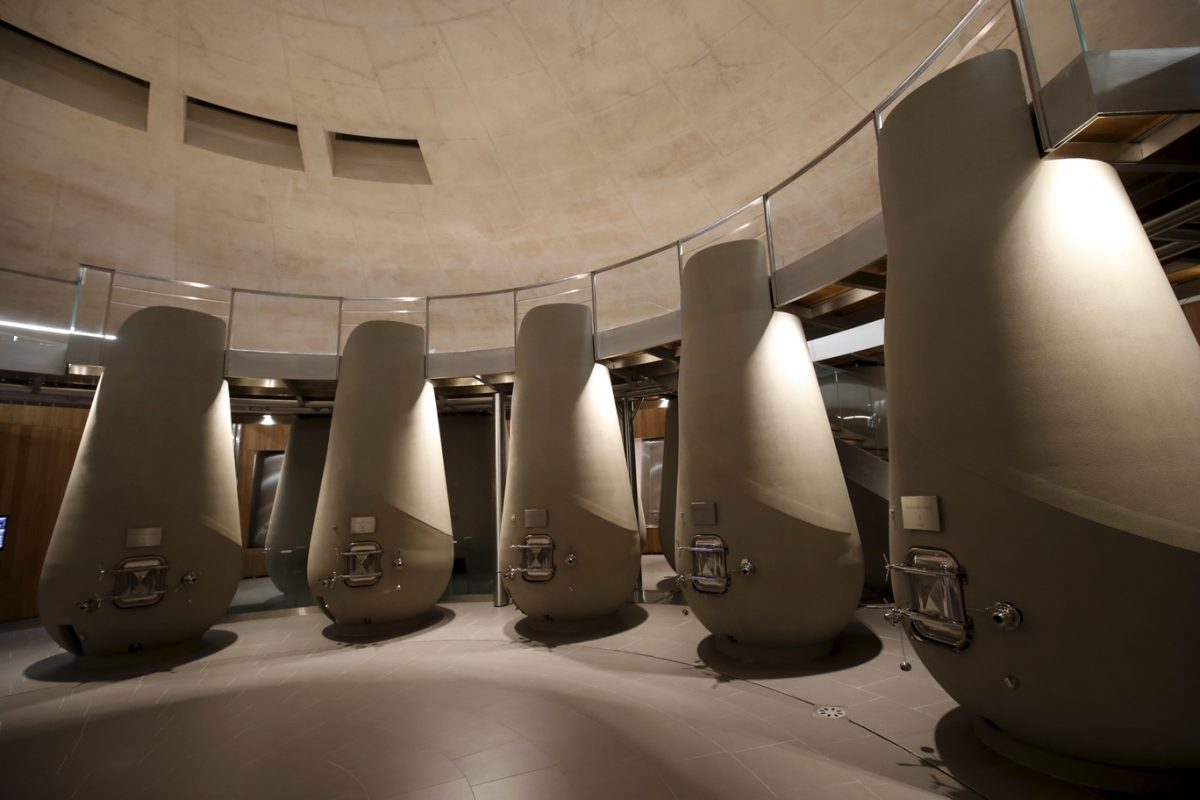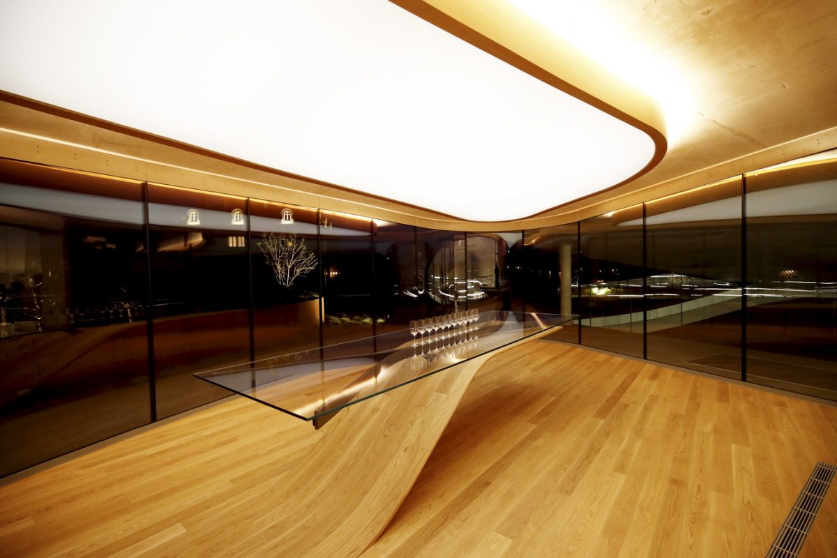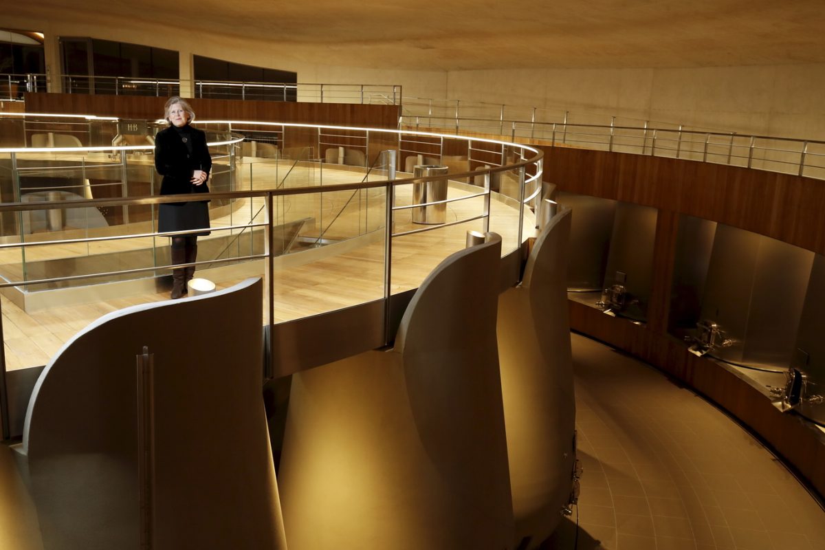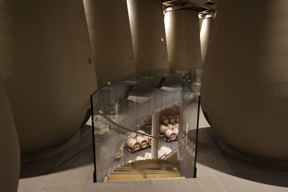 Zen, le mot est lancé : tout ici concourt à véhiculer un sentiment de sérénité, de fluidité, d’harmonie. Le choix des matières, nobles et épurées – béton, bois, verre, acier – sans être aseptisées. La circulation facilitée, aussi bien pour les membres de l’équipe qui apportent la vendange, travaillent au cuvier ou au chai, que pour les visiteurs qui viendront découvrir ces installations (actuellement près de 8000 personnes par an). La prouesse architecturale et technique, entre la voûte circulaire de 38 mètres de diamètre soutenue sans aucun pilier et incluant un puits de jour, les 54 cuves gravitaires en inox et béton qui font le tour du bâtiment pour un grand confort de travail au plus près du parcellaire, le chai circulaire lui aussi pouvant accueillir plus de 900 barriques, le contrôle de l’ensemble des opérations et consommations d’eau et énergie par écran tactile. Et surtout cette ambiance générale, entre “compression et dilatation” comme le souligne Daniel Romeo, dégageant calme et précision, jusque dans la salle de dégustation permettant d’embrasser du regard le jardin, les vignes, le château et le cuvier. Tout un écosystème qui constitue la force de Haut-Bailly depuis des générations.