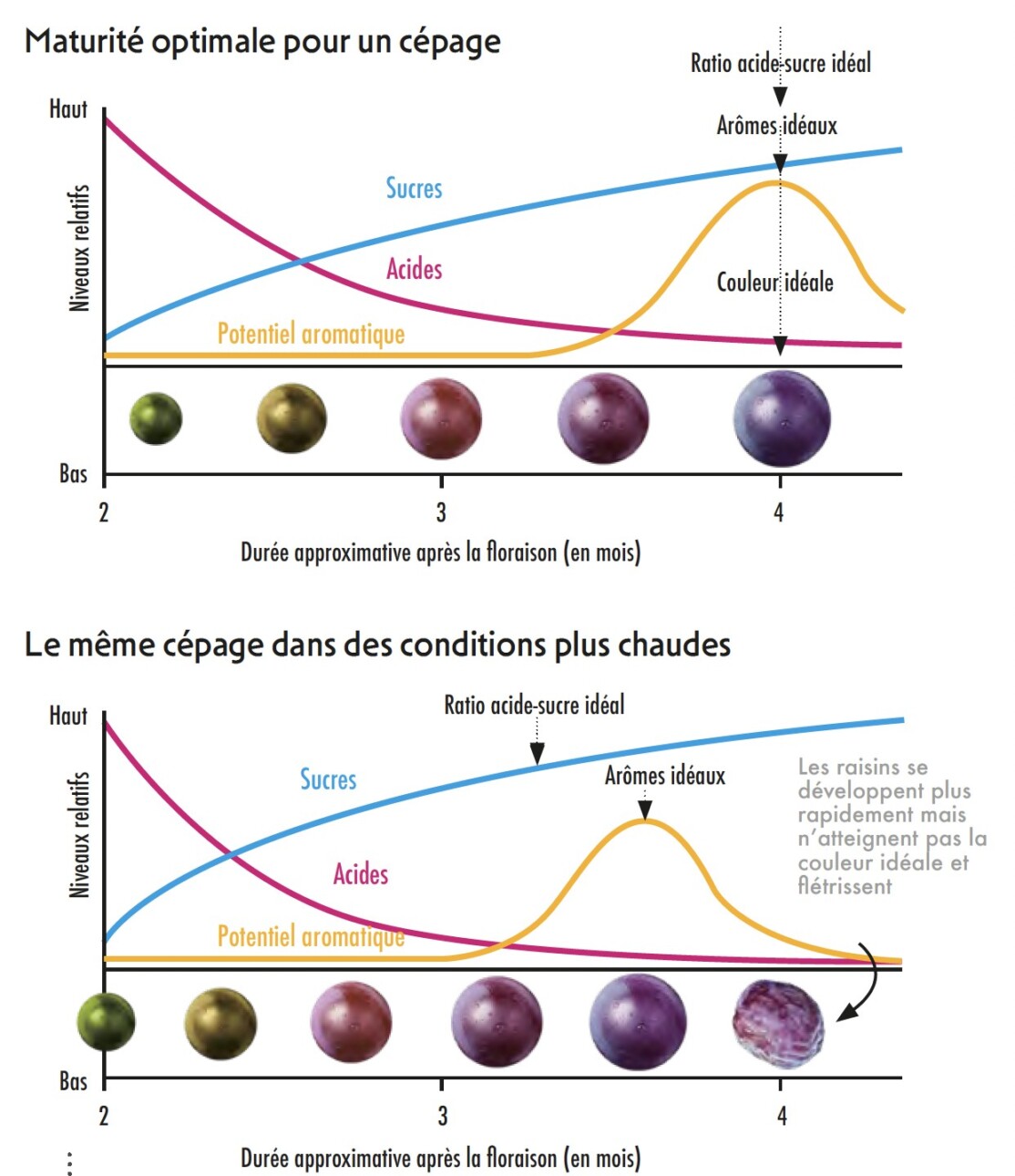 Oui, exactement. Il y a un diagramme dans mon livre à ce sujet. C’est assez éloquent ce déphasage qui se créée dans un climat plus chaud entre la courbe de maturité physiologique (sucre et acidité) et la courbe de maturité phénolique (les arômes). Il en résulte des vins déséquilibrés. Pour y remédier, il y aura forcément des adaptations des techniques de viticulture.