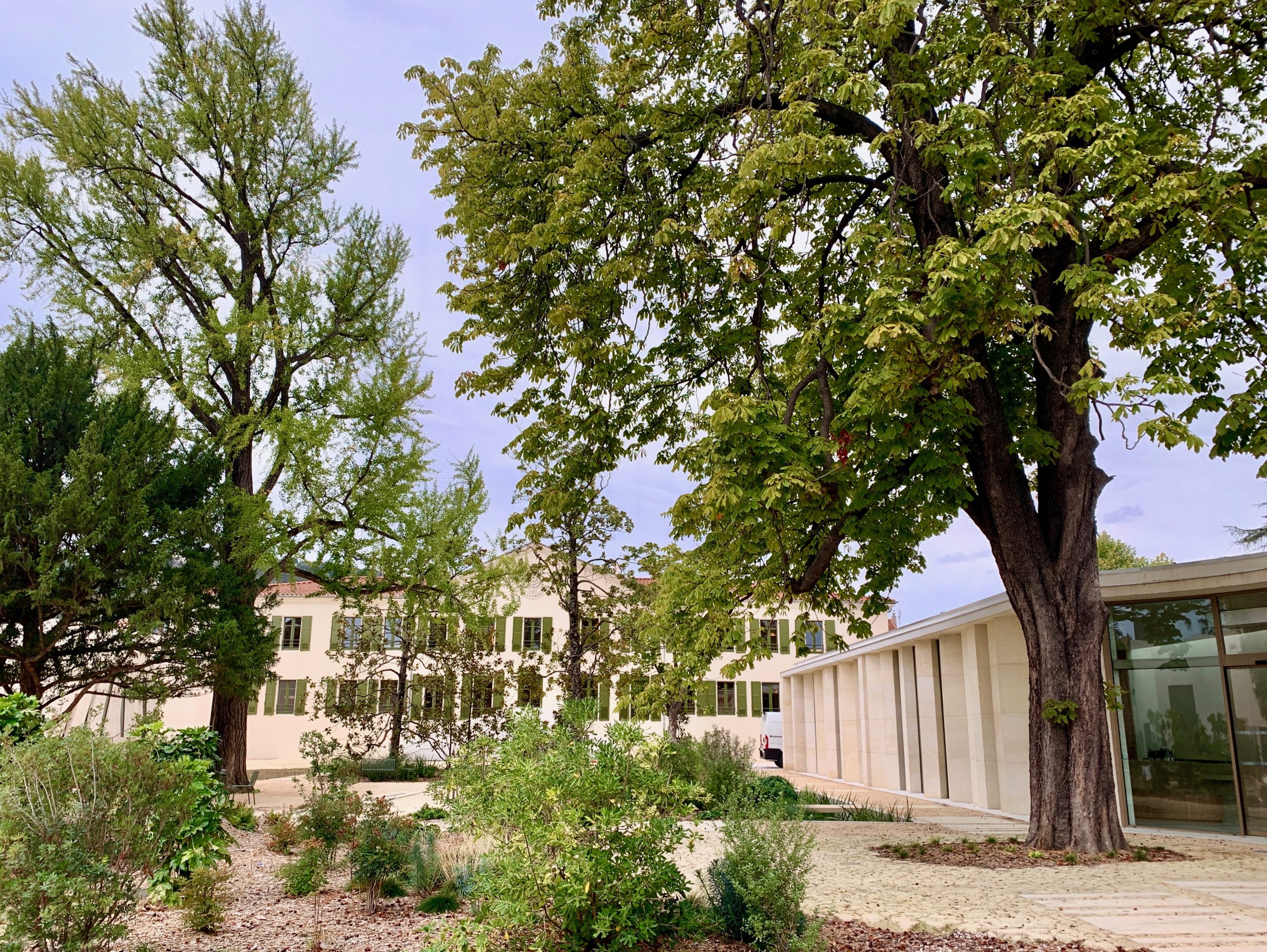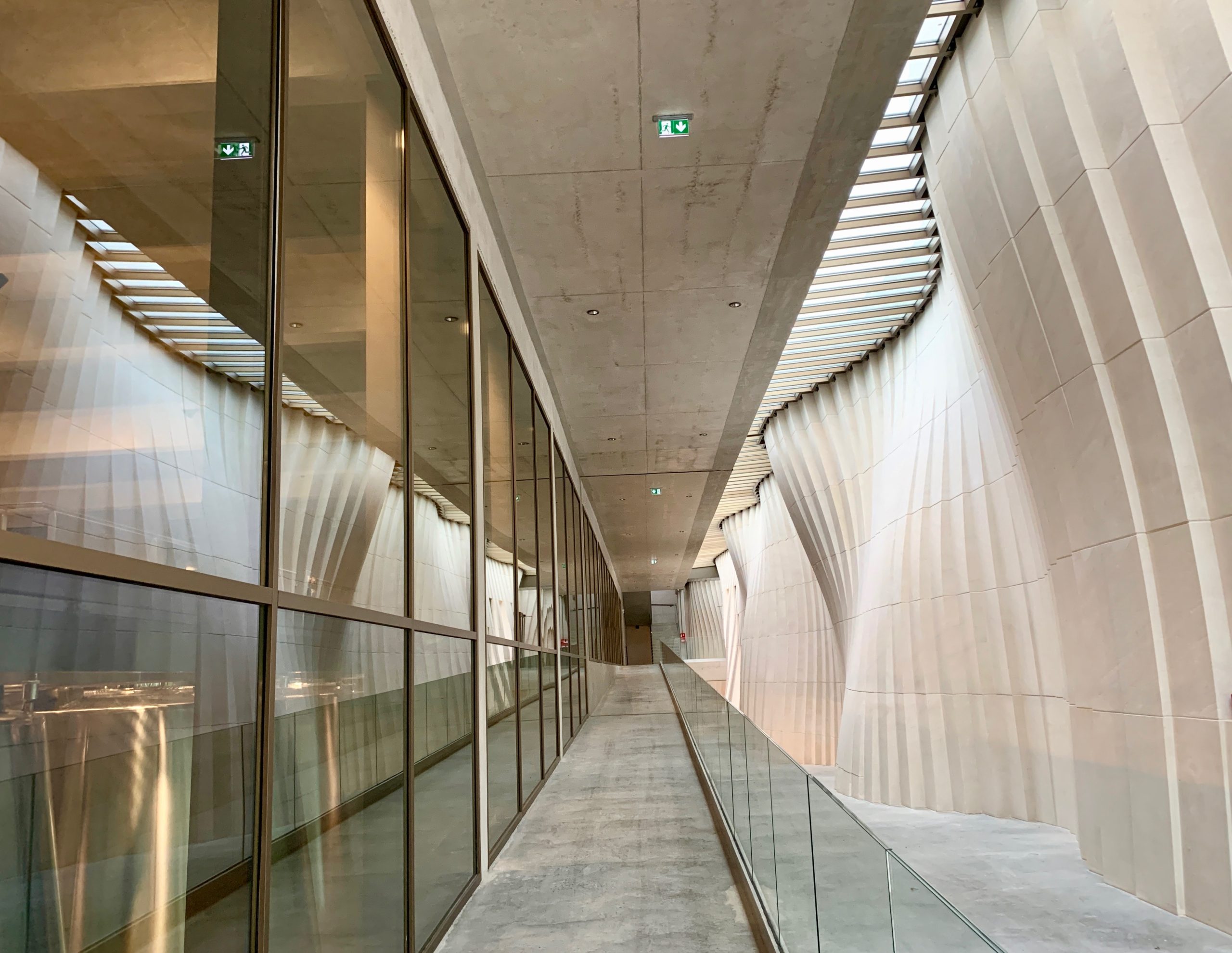 Cette activité de réceptif est sous la houlette de Frédérick Nebout, ex-directeur de l’office de tourisme d’Épernay, recruté pour développer les offres œnotouristiques. L’ensemble est entouré d’un parc dans lequel ont été conservés marronniers, gingkos et magnolias, vieux de plusieurs décennies. Le reste des jardins a été réaménagé avec des essences locales et méditerranéennes nécessitant peu d’entretien. Ce bel ilôt de verdure, au coeur de Tain l’Hermitage, est surtout bordé d’un magnifique mur voile de 278 blocs de pierre calcaire des carrières d’Estaillade et Fontvieille, rappelant les terrasses des collines de l’Hermitage. Il est signé par l’architecte suédois Karl Fredrik Svenstedt (l’auteur également du chai du château de Selle des Domaines Ott dans le Var). L’œuvre monumentale fait la transition entre le parc et les chais longés par une immense baie vitrée permettant d’observer l’outil de production flambant neuf. « L’idée est de pouvoir expliquer la production sans gêner l’activité et d’attirer les nombreux visiteurs de la chocolaterie Valrhona juste derrière » conclut Jacques Grange.