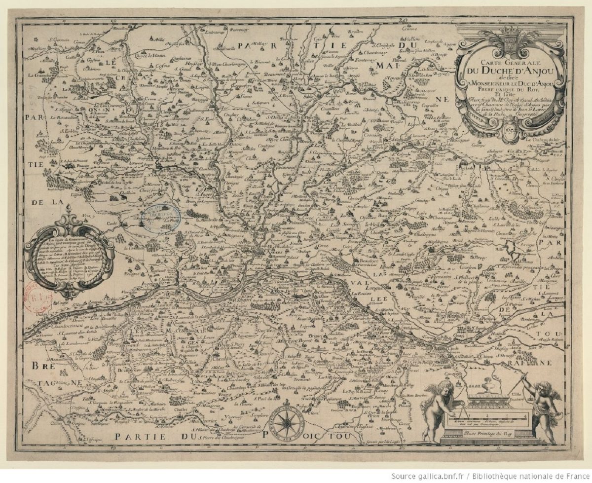 Dans le monde actuel, Bourgueil et Saint-Nicolas-de-Bourgueil, tout comme Chinon, font partie de la Touraine. Même si la « frontière » entre Anjou et Touraine n’est pas définie de façon complètement officielle, on s’accorde habituellement à la situer à Candes-Saint-Martin, à la confluence entre la Loire et la Vienne, en aval justement de Bourgueil (au nord) et de Chinon (au sud). Ce ne fut pas toujours le cas. Un coup d’œil à la carte de la province d’Anjou datée de 1654, au début du règne de Louis XIV, montre bien l’étendue de l’Anjou de part et d’autre de la ville d’Angers. Le duc d’Anjou est la 2è personnalité de la France, le frère du Roi.