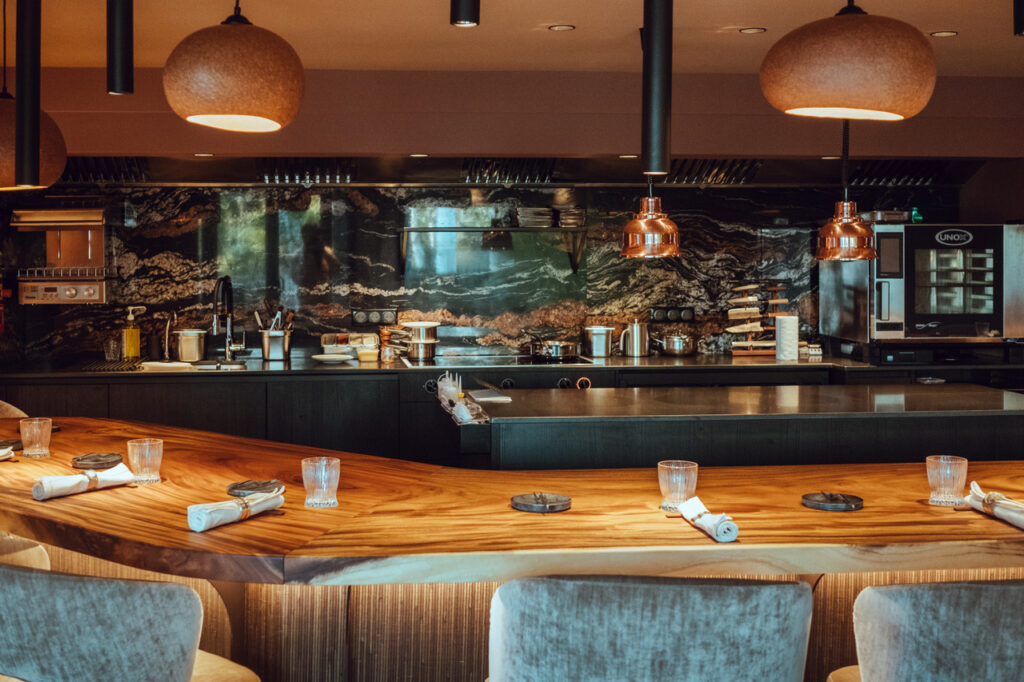Dans l’ancien caveau de dégustation du château d’Autignac, ouvrant sur la terrasse et le jardin, ils imaginent une proposition inédite : un comptoir de 14 places (et une table de 4), face à la cuisine ouverte. Le chef travaille en direct et raconte ses choix du jour : cédrat des Pyrénées-Orientales et yuzu du jardin, olives de Lucques fumées sur place, rouille de seiche devenue aérienne en espuma.