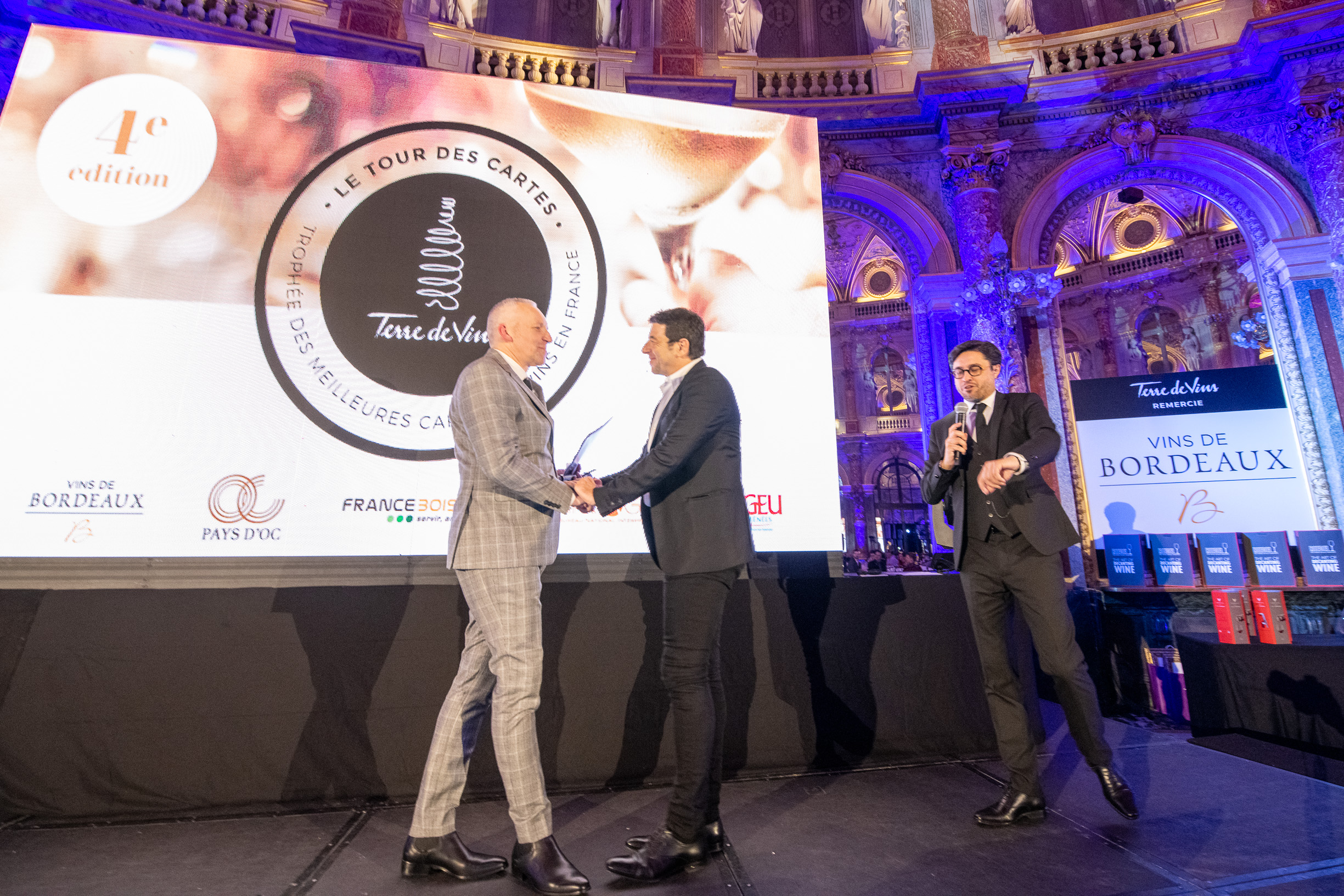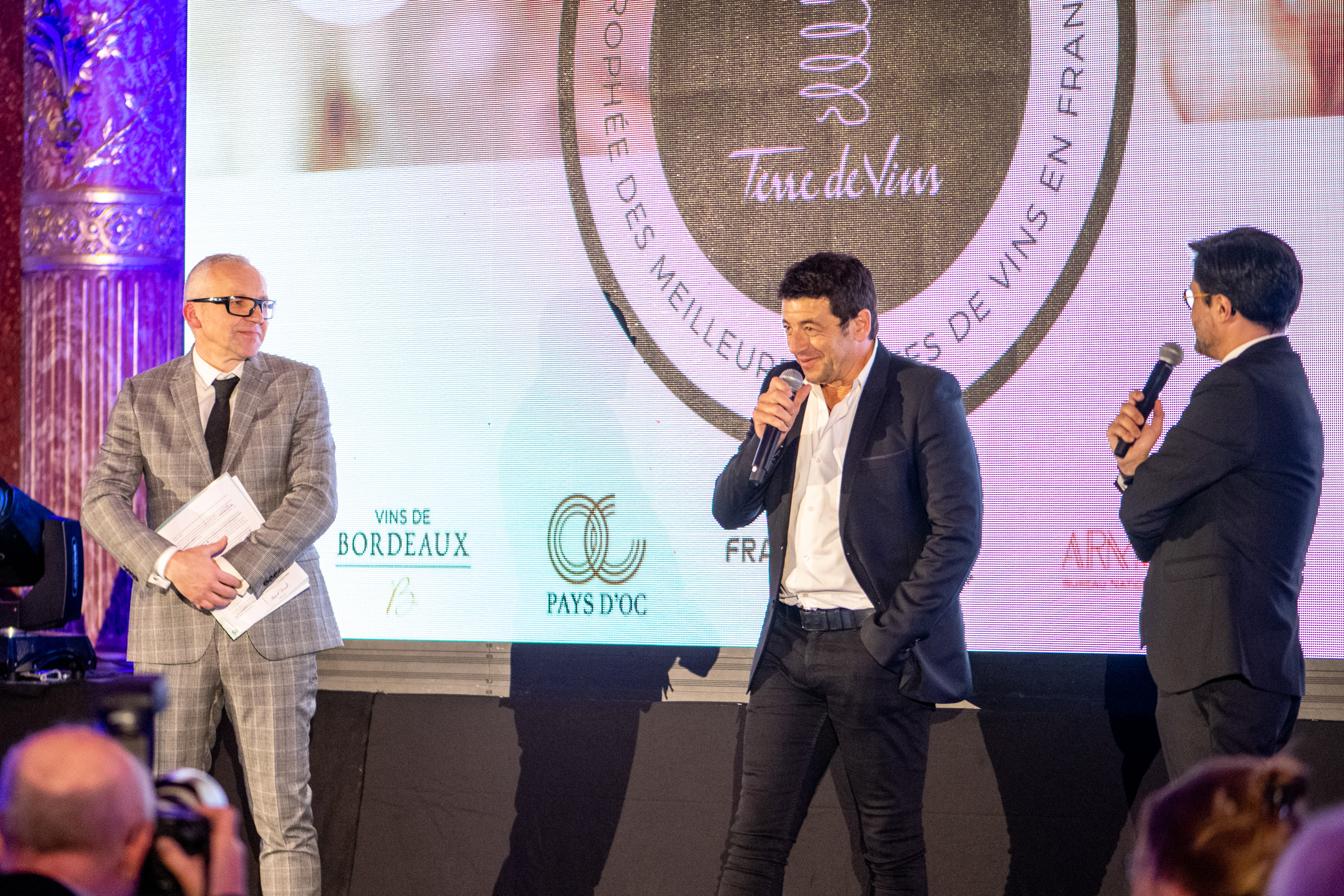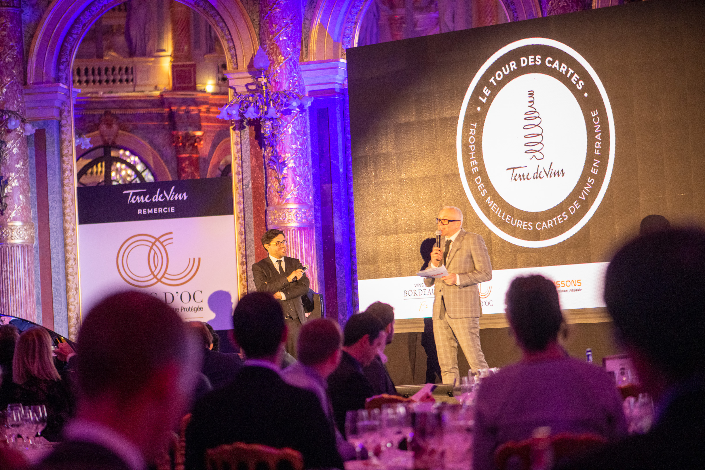 C’est dans le magnifique écrin du salon Opéra de l’Hôtel Intercontinental Paris – Le Grand que se déroulait hier soir la cérémonie du Tour des Cartes. Pour la quatrième édition de ses trophées récompensant les meilleures cartes de vins en France, Terre de Vins avait convoqué un parrain de choix : l’artiste Patrick Bruel – acteur, chanteur, néo-vigneron et amoureux du vin de longue date*. Malgré les difficultés de circulation qui frappent actuellement le pays, la grande majorité des 100 finalistes désignés la semaine dernière par le jury présidé par Philippe Faure-Brac avait fait le chemin pour assister à cette soirée placée sous le signe de la convivialité et de l’excellence. “Ce soir il y aura 10 lauréats, mais vous êtes tous, vous les 100 finalistes distingués par le jury du Tour des Cartes, des membres du club de l’excellence de la restauration française, et nous vous remercions pour votre présence à nos côtés”, expliquait Rodolphe Wartel, directeur de Terre de Vins, en préambule de la cérémonie. C’est en effet à un travail de fourmi que s’est livré le jury, en détectant quelque 8000 établissements français, en retenant en octobre dernier 800 cartes des vins pour finalement concentrer la sélection sur 100 finalistes et 10 lauréats – 4 prix spéciaux et un grand vainqueur pour chacune des six catégories.