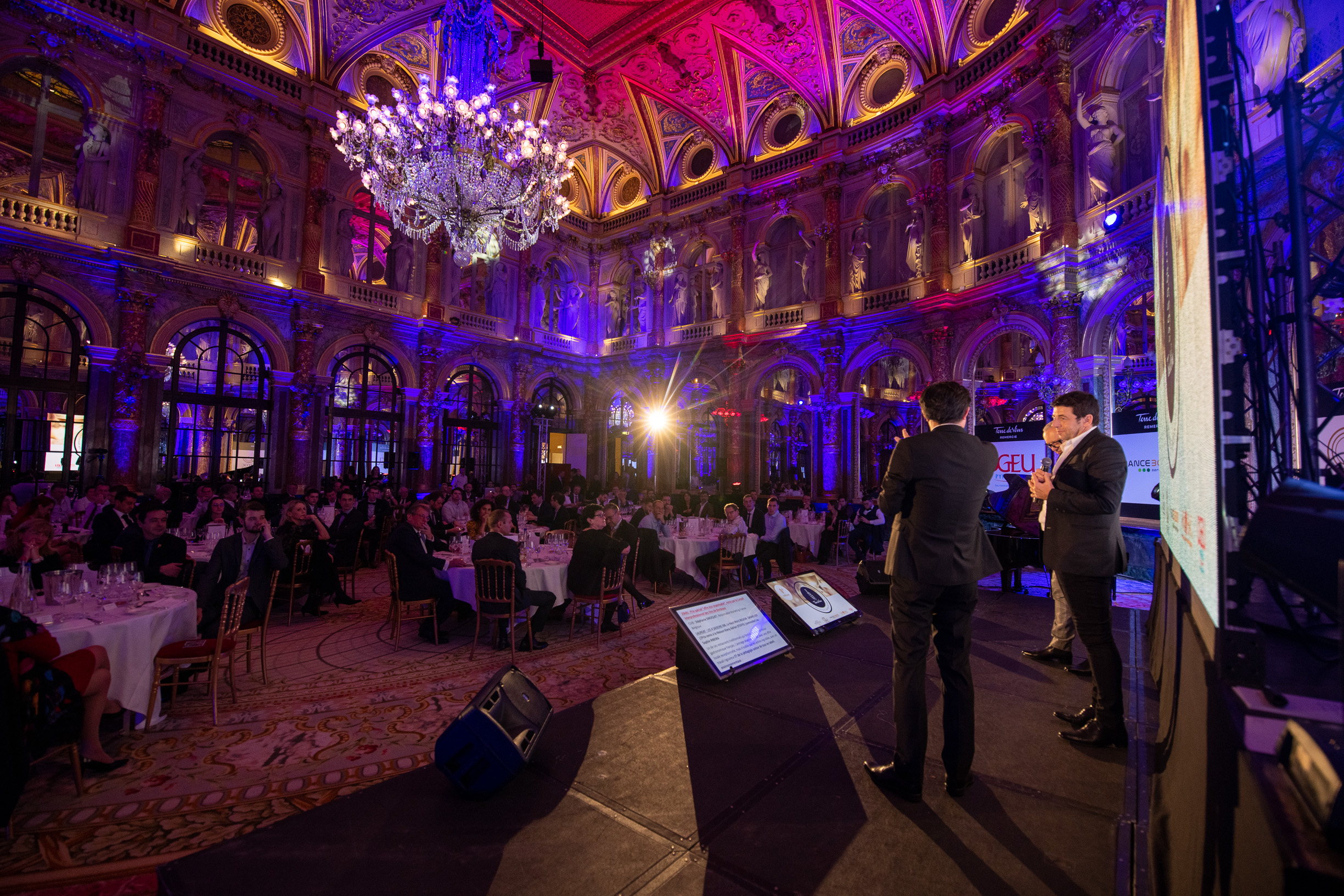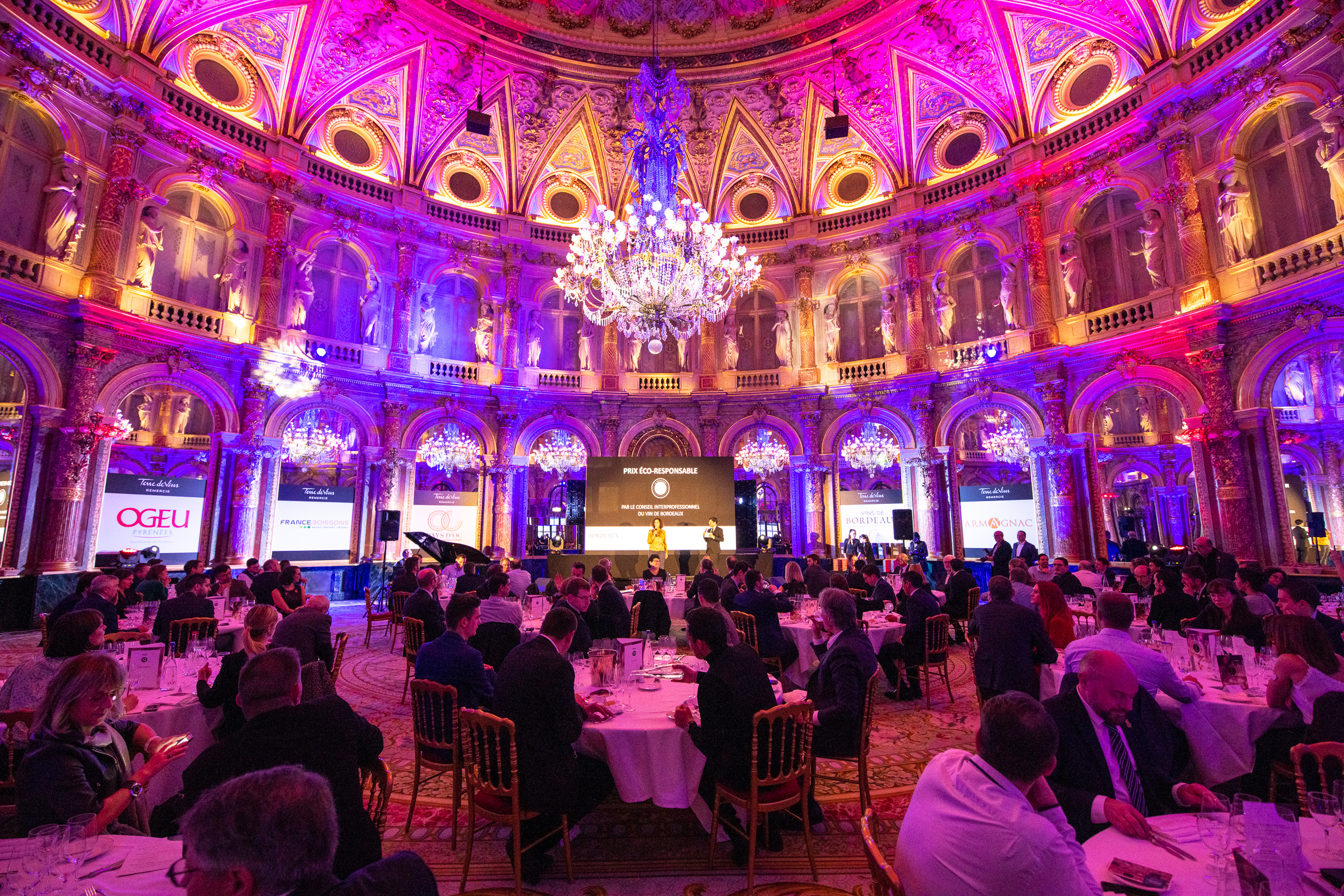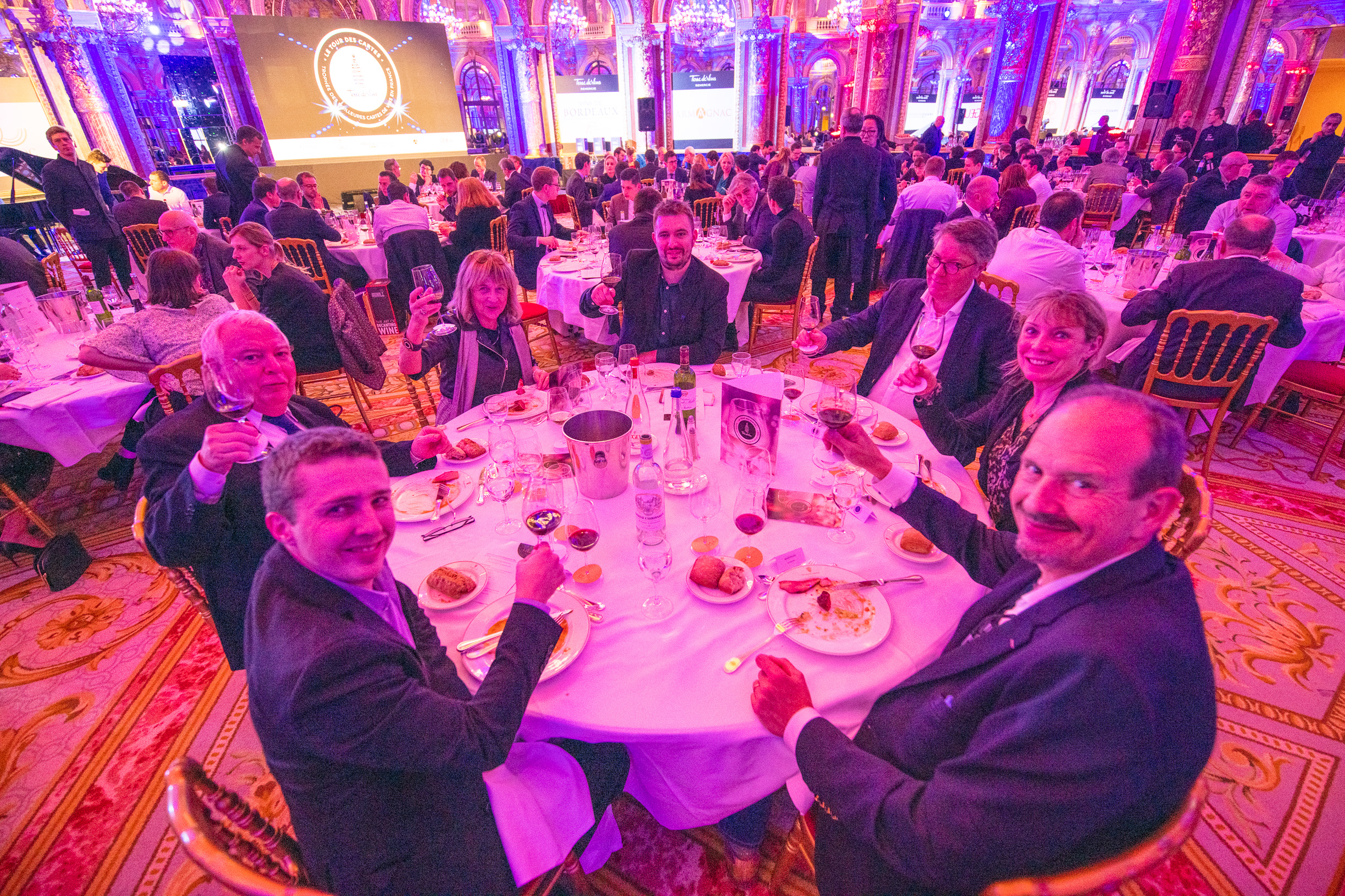C’est dans le magnifique écrin du salon Opéra de l’Hôtel Intercontinental Paris – Le Grand que se déroulait hier soir la cérémonie du Tour des Cartes. Pour la quatrième édition de ses trophées récompensant les meilleures cartes de vins en France, Terre de Vins avait convoqué un parrain de choix : l’artiste Patrick Bruel – acteur, chanteur, néo-vigneron et amoureux du vin de longue date*. Malgré les difficultés de circulation qui frappent actuellement le pays, la grande majorité des 100 finalistes désignés la semaine dernière par le jury présidé par Philippe Faure-Brac avait fait le chemin pour assister à cette soirée placée sous le signe de la convivialité et de l’excellence. “Ce soir il y aura 10 lauréats, mais vous êtes tous, vous les 100 finalistes distingués par le jury du Tour des Cartes, des membres du club de l’excellence de la restauration française, et nous vous remercions pour votre présence à nos côtés”, expliquait Rodolphe Wartel, directeur de Terre de Vins, en préambule de la cérémonie. C’est en effet à un travail de fourmi que s’est livré le jury, en détectant quelque 8000 établissements français, en retenant en octobre dernier 800 cartes des vins pour finalement concentrer la sélection sur 100 finalistes et 10 lauréats – 4 prix spéciaux et un grand vainqueur pour chacune des six catégories.