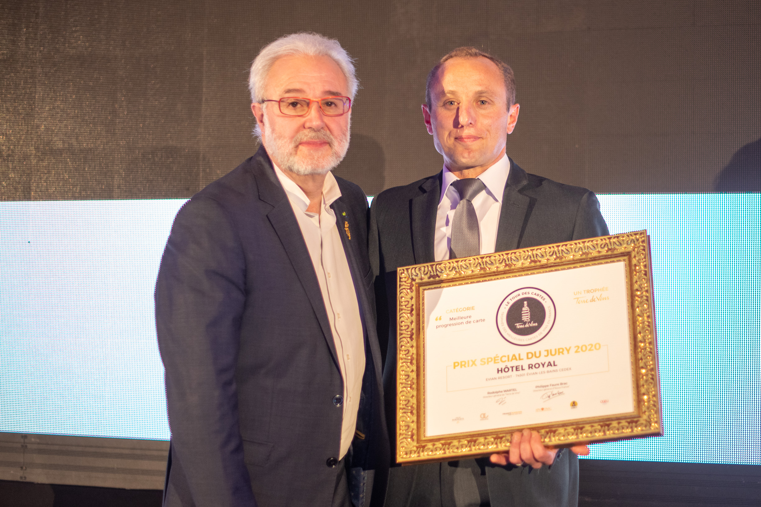 Ce sont justement les prix spéciaux qui ont inauguré la cérémonie : le Prix Spécial de l’offre éco-responsable remis à l’établissement “Les Quatres Saisons” à Kruth (68) par Stéphanie Sinoquet de l’interprofession des vins de Bordeaux ; le Prix Spécial de l’offre de vin au verre remis à l’établissement Maison Kieny à Riedisheim (68) par Delphine Lorentz de vins Pays d’Oc IGP ; le Prix Spécial de l’offre Spiritueux remis à l’établissement Skab à Nîmes (30) par Olivier Goujon de l’interprofession de l’Armagnac ; et enfin le Prix Spécial de la meilleure progression de carte remis par le président du jury Philippe Faure-Brac à l’établissement Hôtel Royal à Evian les Bains (74). Philippe Faure-Brac qui a pris soin d’insister sur cette notion de progression et d’évolution nécessaire d’une cartes des vins : “une carte des vins c’est toujours une photographie à un instant bien précis, mais elle évolue, elle vit. Notre travail est de la faire grandir, de l’enrichir, de sentir les évolutions des tendances et des attentes des consommateurs : il se caractérise dans le temps, c’est pourquoi nous avons voulu remettre pour la première fois ce prix de la meilleure progression”, a-t-il précisé avant de saluer le patient travail collectif réalisé par le jury et par l’équipe de Terre de Vins, emmenés par Joëlle Weiss Boisson qui pilote les trophées depuis leur création. Le président du jury a également fait un appel du pied à son confrère Serge Dubs qui, après avoir inauguré le Tour des Cartes il y a quatre ans, pourrait bien lui succéder de nouveau l’année prochaine.