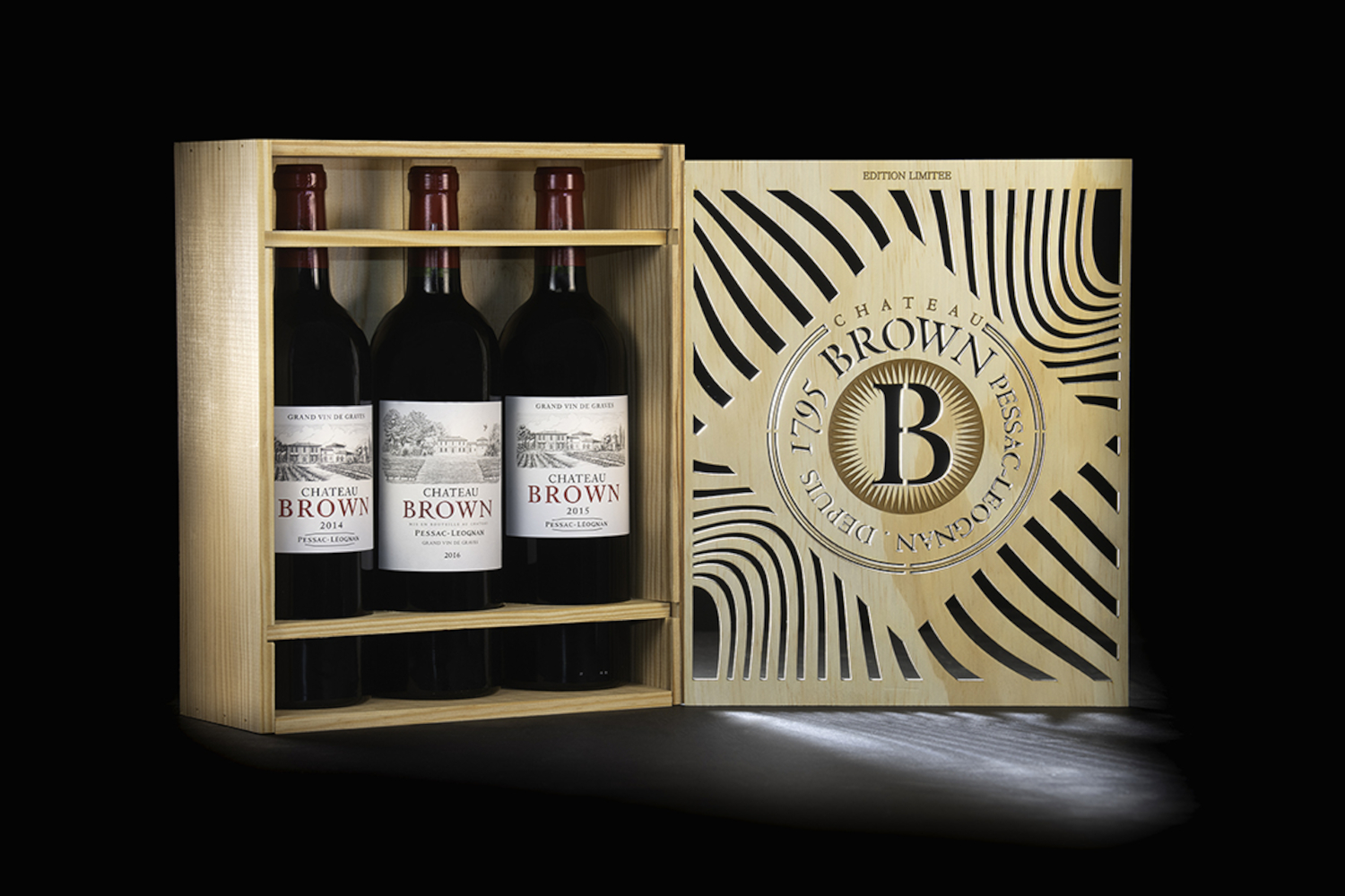 Quand on déguste les vins du château Brown, situé sur l’appellation Pessac-Léognan, et notamment le millésime 2014 avec ses arômes fumés, ses tanins mûrs, ses petits fruits noirs rehaussés par des notes boisées, on comprend très vite pourquoi les Anglais se sont battus pendant plus de 100 ans au Moyen-Âge pour ne pas lâcher l’Aquitaine et pourquoi Shakespeare dans sa pièce Henri IV donne à boire à Falstaff toute une flotte de vins de Bordeaux. C’est aussi l’origine du château Brown : le souvenir qu’ont gardé les habitants d’Outre-Manche de leur séjour médiéval dans le Bordelais leur ont laissé un petit goût de « reviens-y » et au XVIIe et XVIIIe siècles de nombreux négociants Anglais et même Ecossais comme John Lewis Brown sont revenus s’établir dans la région pour faire commerce de vins. Avec son coffret Nuances réunissant les millésimes 2014, 2015 et 2016, le château Brown nous invite à poursuivre cette épopée, et nous propose un bel écrin, en pin massif des Landes, auquel on pourra facilement donner une seconde vie en le transformant par exemple en lampe d’ambiance.