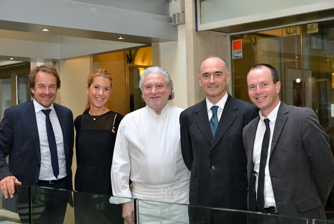 Sur la photo ci-dessous : Laurent Dufau, gérant, Sophie Marc, communication, Alain Dutournier, chef du Carré des Feuillants, Jean-Pierre Denis, président du groupe propriétaire Arkéa Crédit Mutuel, Vincent Millet, directeur d’exploitation.