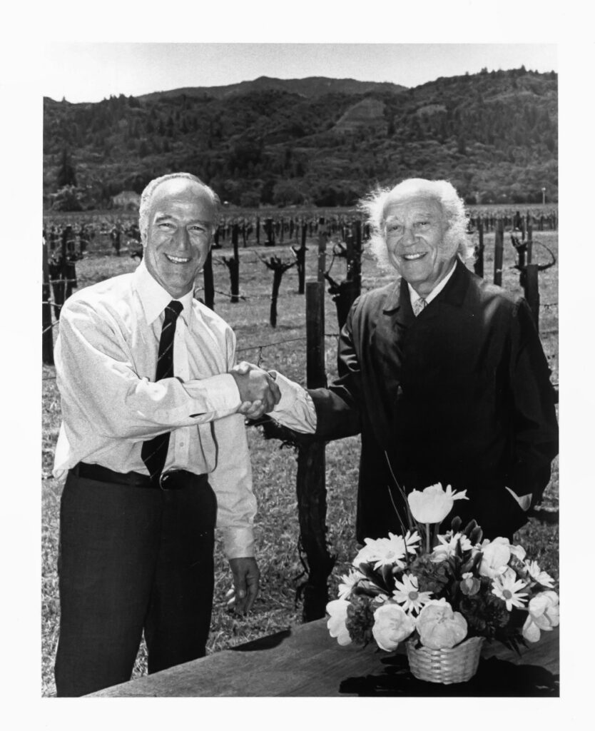 Dans les années 1970, les vins de Californie commencent tout juste à se faire connaître en dehors de leurs frontières, suscitant la curiosité de Français piqués au vif par l’insolente réussite de ces nectars ensoleillés qui n’ont pas peur de bousculer les codes. À cette époque, rares sont les excursions de vignerons hexagonaux loin de leur territoire d’origine, en particulier de l’autre côté de l’Atlantique. Il faudra la rencontre entre deux hommes pour que jaillisse l’étincelle : celle du Baron Philippe de Rothschild et de Robert Mondavi. La rencontre entre ces deux bâtisseurs accouche d’une incroyable vision, donner naissance à l’équivalent d’un grand cru bordelais, au cœur de la Napa Valley. Le nom de code qui accompagne les débuts du projet est d’ailleurs éloquent : « NapaMédoc ». Finalement, c’est un nom bien plus poétique et évocateur qui sera accolé à ce domaine : Opus One.