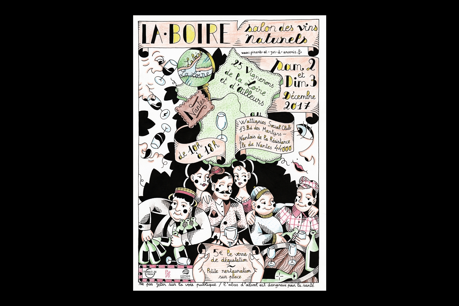 La Boire, seul salon de vins naturels de Nantes aura lieu samedi 2 et dimanche 3 décembre. Il est organisé par l’équipe de Pinards et Jus d’Ancenis, une association de neuf vignerons installés dans le vignoble nantais, sur l’aire d’appellation des Coteaux d’Ancenis (entre Nantes et Angers). L’affiche fait la part belle aux vignerons de Loire, notamment au Muscadet (logique), mais l’Alsace, le Jura, la Provence ou le Rhône sont aussi représentés.