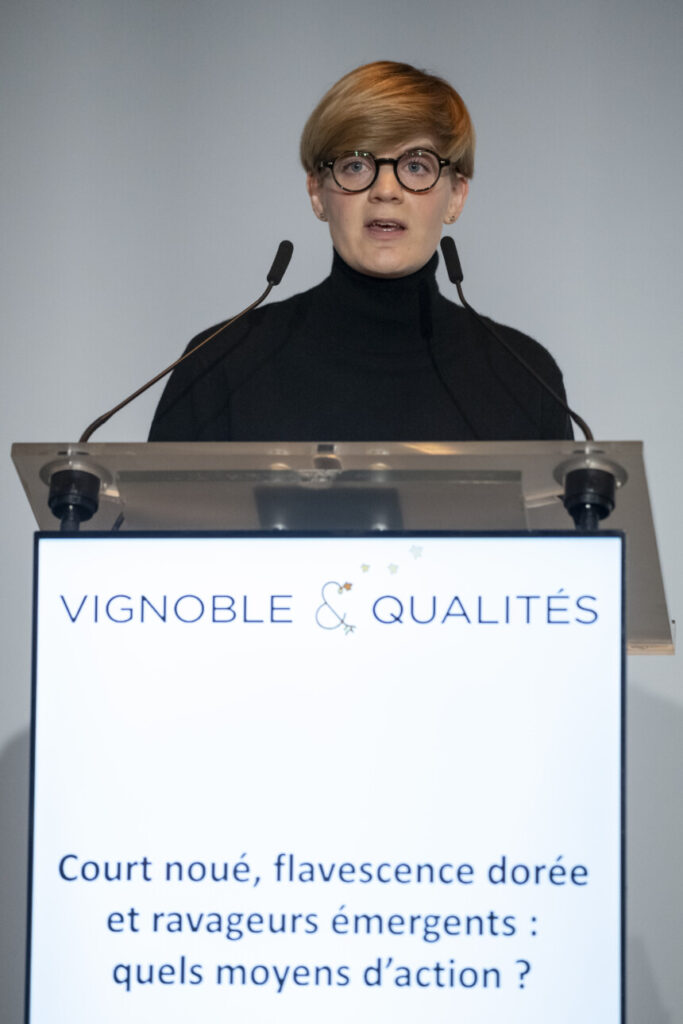 Concernant la flavescence dorée, maladie beaucoup plus explosive repérée pour la première fois dans le Sud-Ouest de la France dans les années 1950, elle est provoquée par une bactérie (phytoplasme) qui se multiplie dans la sève et qui est transmise de vigne en vigne par une cicadelle invasive d’origine nord-américaine. La rapidité de l’évolution est beaucoup importante que le court-noué. Au sein d’une parcelle, d’une année sur l’autre, on observe une multiplication par un facteur 18 du nombre de ceps contaminés. Les mesures déployées sont le contrôle du matériel de plantation, la prospection du vignoble avec la formation de l’ensemble des acteurs pour parvenir à détecter les pieds contaminés au plus tôt, et l’emploi d’insecticides afin de bloquer la dispersion opérée par les cicadelles. Les études présentées ont permis de comprendre pourquoi en Champagne, la diffusion est aussi importante. L’un des facteurs aggravants est le climat septentrional, avec des hivers froids et des printemps chauds. On dit souvent que les hivers froids permettent de tuer les microbes et les maladies. Mais en ce qui concerne la cicadelle, ils accroissent au contraire le nombre d’éclosion. Les températures printanières plus élevées favorisent quant à elles la vitesse de multiplication des phytoplasmes dans la sève.