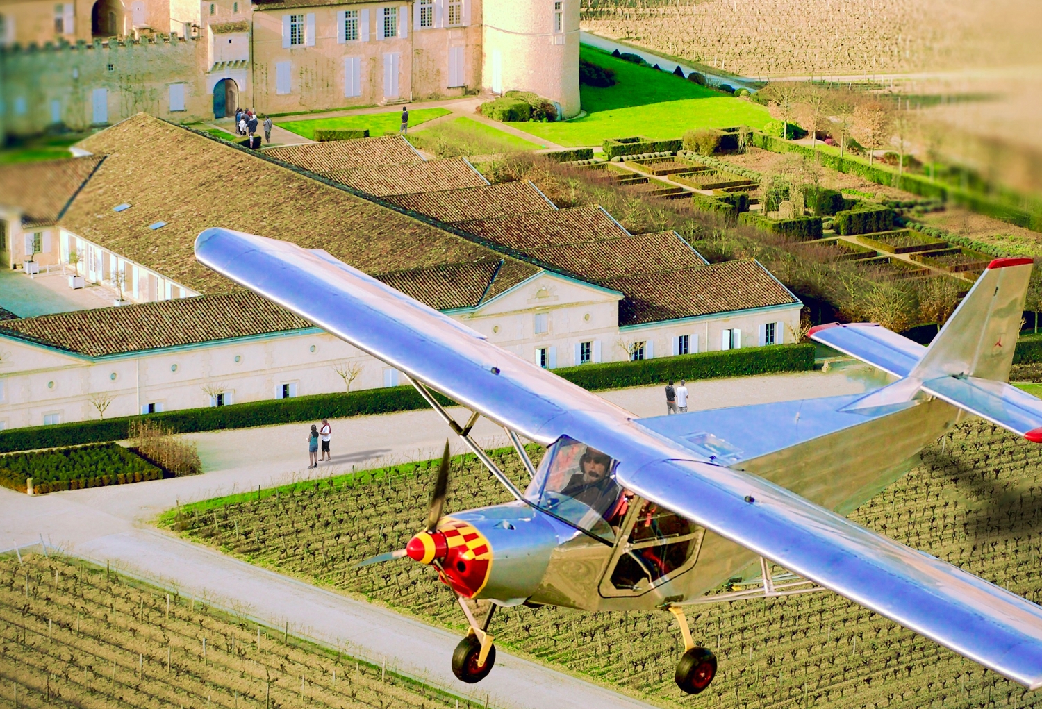 Emmanuelle et Bertrand Amart, les propriétaires du château Vénus, à Illats (Graves), vous invitent à prendre un peu de hauteur sur la région. Embarquement immédiat à bord d’un de leurs trois avions de tourisme deux places pour un décollage au milieu des vignes de la propriété, puis un survol des vignobles et bâtiments historiques locaux, ou du Bassin d’Arcachon. Durant cette escapade aérienne, le propriétaire, titulaire du brevet de pilotage, ou l’un des deux autres pilotes, ne manqueront pas de vous conter les histoires et anecdotes au fil des paysages défilant sous vos yeux. Sept formules “Fly and Wine” différentes (dès 69 €), avec à l’atterrissage visite et dégustation des vins du domaine. Original, dépaysant, éblouissant !