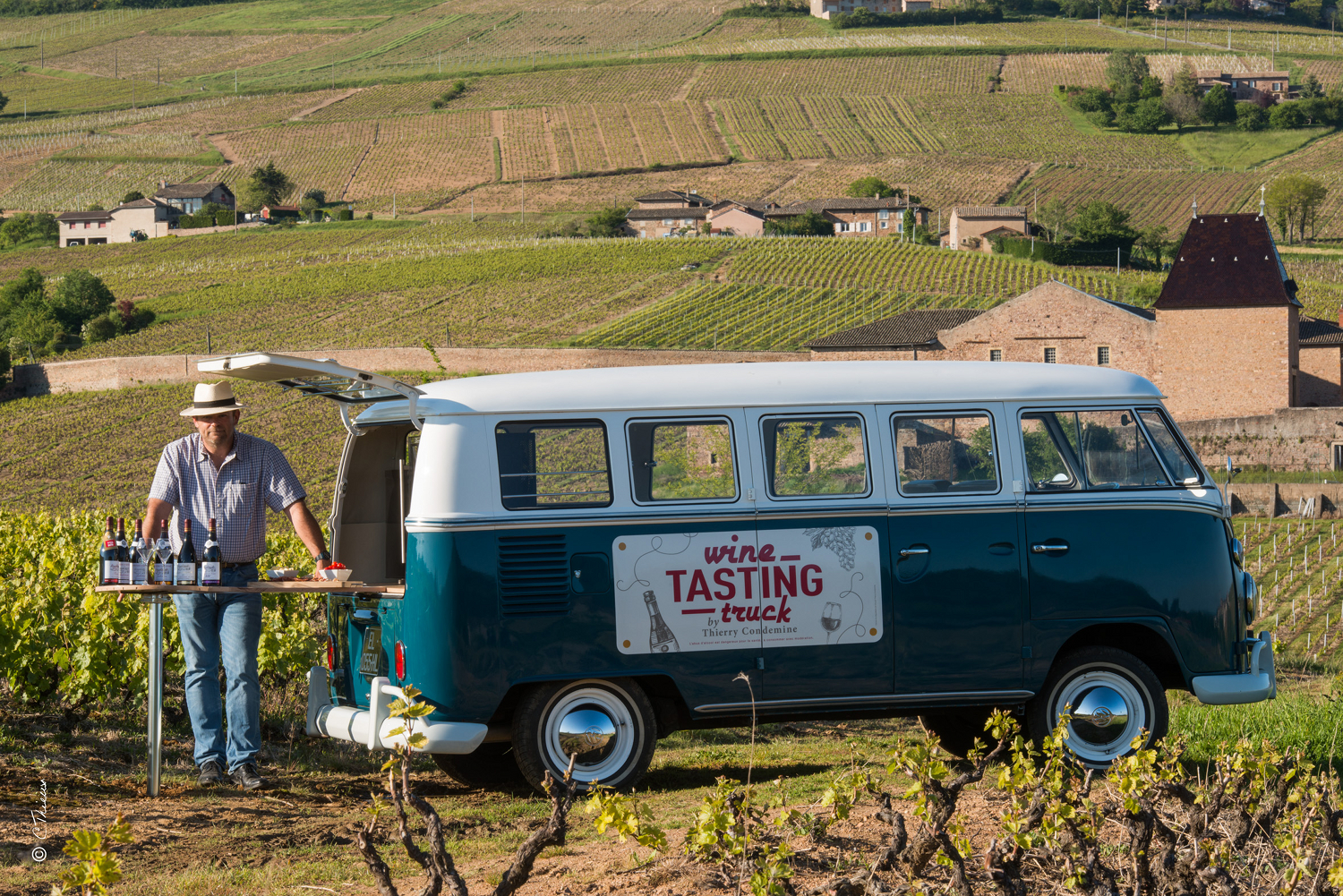 Au milieu des années 1980, Thierry Condemine s’installe à 22 ans sur les quelques hectares de vignes familiales. Aujourd’hui, son exploitation en compte 40 en Juliénas, Fleurie et Moulin-à-Vent. Au Château de Juliénas, le fief de la famille et magnifique bâtisse historique (ancienne propriété des seigneurs de Beaujeu), l’accueil à la cave s’est développé depuis plus de dix ans de façon originale. Thierry Condemine propose divers format de visite de 45 minutes à deux heures. La plus décalée : « le wine tasting truck ». Un vieux combi Volkswagen aménagé en « camion à boire » et qui permet à Thierry de balader les visiteurs dans les vignes en leur parlant du terroir où le combi se gare, avant de déguster le vin dans la parcelle qui l’a vu naître.