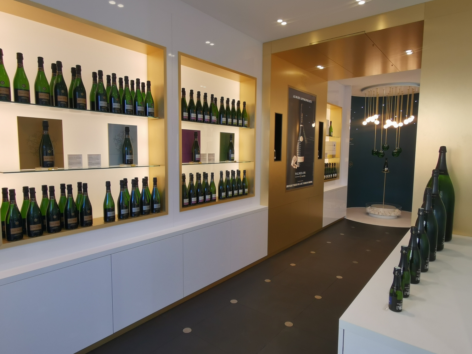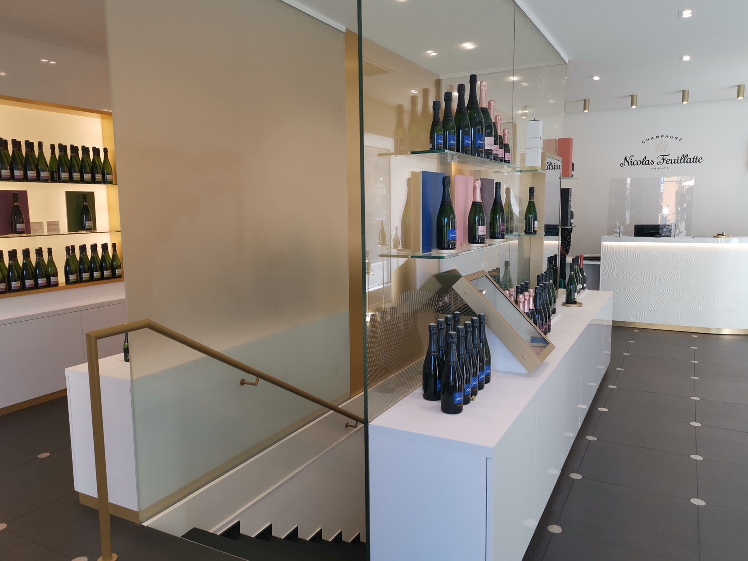 Pour ceux qui connaissaient la boutique Nicolas Feuillatte ancienne mouture, le changement est saisissant. Si l’adresse n’a pas changé, toujours à deux pas de la salle Pleyel, le lieu rouvert il y a quelques jours seulement, apparaît métamorphosé. De grandes vitrines laissent entrevoir un espace lumineux, très moderne où toute la gamme de champagnes peut être achetée. Une cave permet même de repartir avec une bouteille bien fraîche. Mais l’essentiel n’est pas là. L’espace est aussi l’occasion de s’immerger dans l’univers de cet acteur majeur de la Champagne. Souvent intimidant, le rapport au champagne n’est pas toujours aisé. Les équipes ont donc imaginé un parcours en trois temps. En seulement quelques minutes, le client qui le souhaite peut se laisser guider par une borne interactive. En renseignant ses goûts et l’occasion de consommation avec des questions très simples, l’amateur sera orienté vers plusieurs cuvées susceptibles de lui convenir. Il peut alors poser la bouteille correspondante sur un socle et voir apparaître sur un miroir une vidéo de Guillaume Roffiaen, le chef de caves, présentant la cuvée. Difficile d’imaginer meilleur ambassadeur…