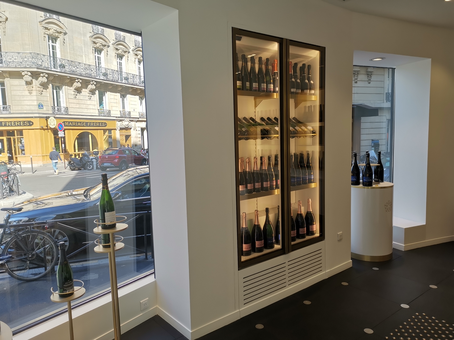 Une autre partie de l’espace est consacrée aux millésimés et une autre aux grands crus, donnant une lisibilité immédiate à toute la gamme. Et vient ensuite le dernier espace du lieu. Très réussi esthétiquement, cette rotonde est une invitation à entrer dans l’un des champagnes par le biais de 5 de ses arômes principaux sélectionnés par Guillaume. Des galets parfumés, développés par une entreprise spécialisée dans les fragrances, permettent ainsi de plonger dans le vin avant même de le goûter. Un espace qui sera renouvelé à chaque saison pour présenter de manière tournante différents vins.