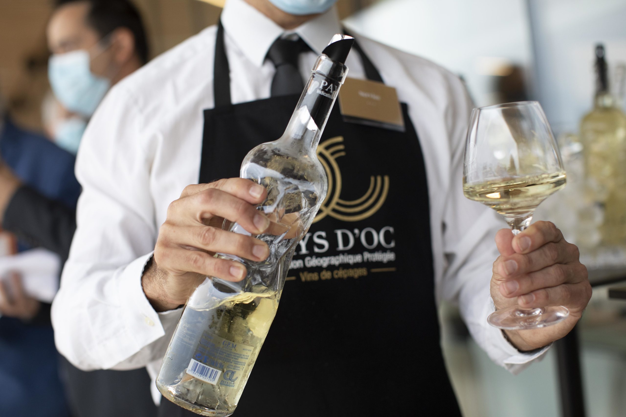 Magali, Jonathan, Audrey, Benjamin font partie des 186 heureux dégustateurs de la soirée découverte des vins de la 13ème édition du palmarès Collection Pays d’Oc IGP. Ils sont amateurs éclairés, curieux, cavistes, œnologues… Ils sont jeunes, ou non, en baskets ou en costard, en sac à dos ou en escarpins. Peu importe, ils sont tous différents mais animés d’une même envie : déguster les cuvées ambassadrices, sélectionnées le 19 juin 2020, par un grand jury international, dont Sylvie Tonnaire, la rédactrice en chef de Terre de Vins. “C’est la première fois que je viens à cette soirée. Je connais très peu de vignerons présents aujourd’hui. Personnellement, je suis amateur de vins bio et j’aime aller à la rencontre des producteurs locaux”, confie Matthieu, la trentaine. Avec son ami américain Jonathan, ils écoutent attentivement Bruno Peyre parler du Mas Neuf, situé entre mer et étang, tout en découvrant la cuvée ambassadrice Sage et Sauvage Rosé. “Je ne savais pas que ce serait si bien organisé” constate Matthieu. L’un des défis de cette soirée a été de la tenir dans le plus strict respect des normes sanitaires liées à la COVID. Résultat : trois sessions de 1h15, ont accueilli chacune 62 personnes, munies de leur masque et de leur crachoir personnel. De ces contraintes drastiques, une ambiance sereine, centrée sur la dégustation et la découverte, s’est immédiatement installée tout au long de l’événement. “Nous avons le temps d’échanger, sans cohue et brouhaha”, ajoute une dégustatrice.