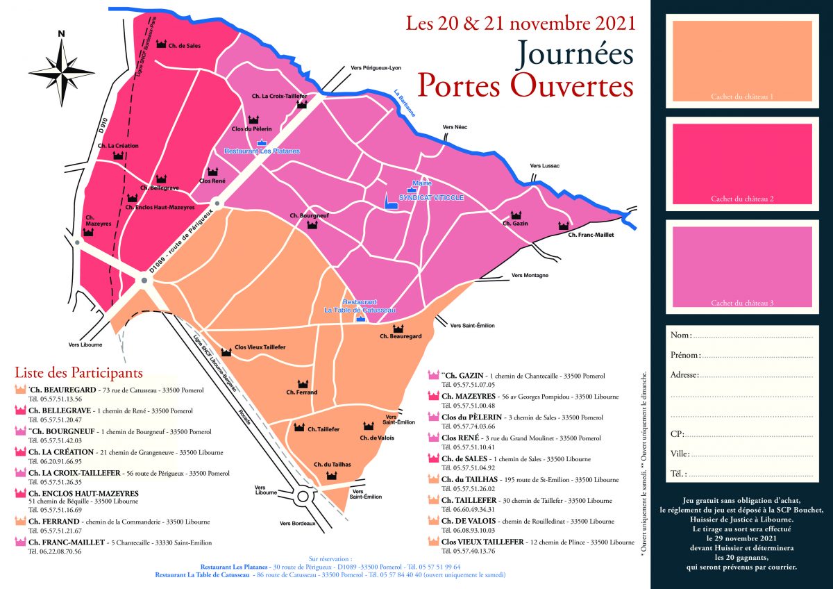 Ces 20 et 21 novembre, 17 propriétés ouvrent leurs portes aux visiteurs dans le cadre des journées Portes Ouvertes. Ces propriétés sont les suivantes : Château Beauregard - Château Bellegrave - Château Bourgneuf - Château La Création - Château La Croix Taillefer - Château Enclos Haut Mazeyres - Château Ferrand - Château Franc Maillet - Château Gazin - Château Mazeyres - Clos du Pélerin - Clos René - Château de Sales - Château du Tailhas - Château Taillefert - Château de Valois - Clos Vieux Taillefer. Pour la restauration, les restaurants Les Platanes et La Table de Catusseau (uniquement le samedi) prennent les réservations.