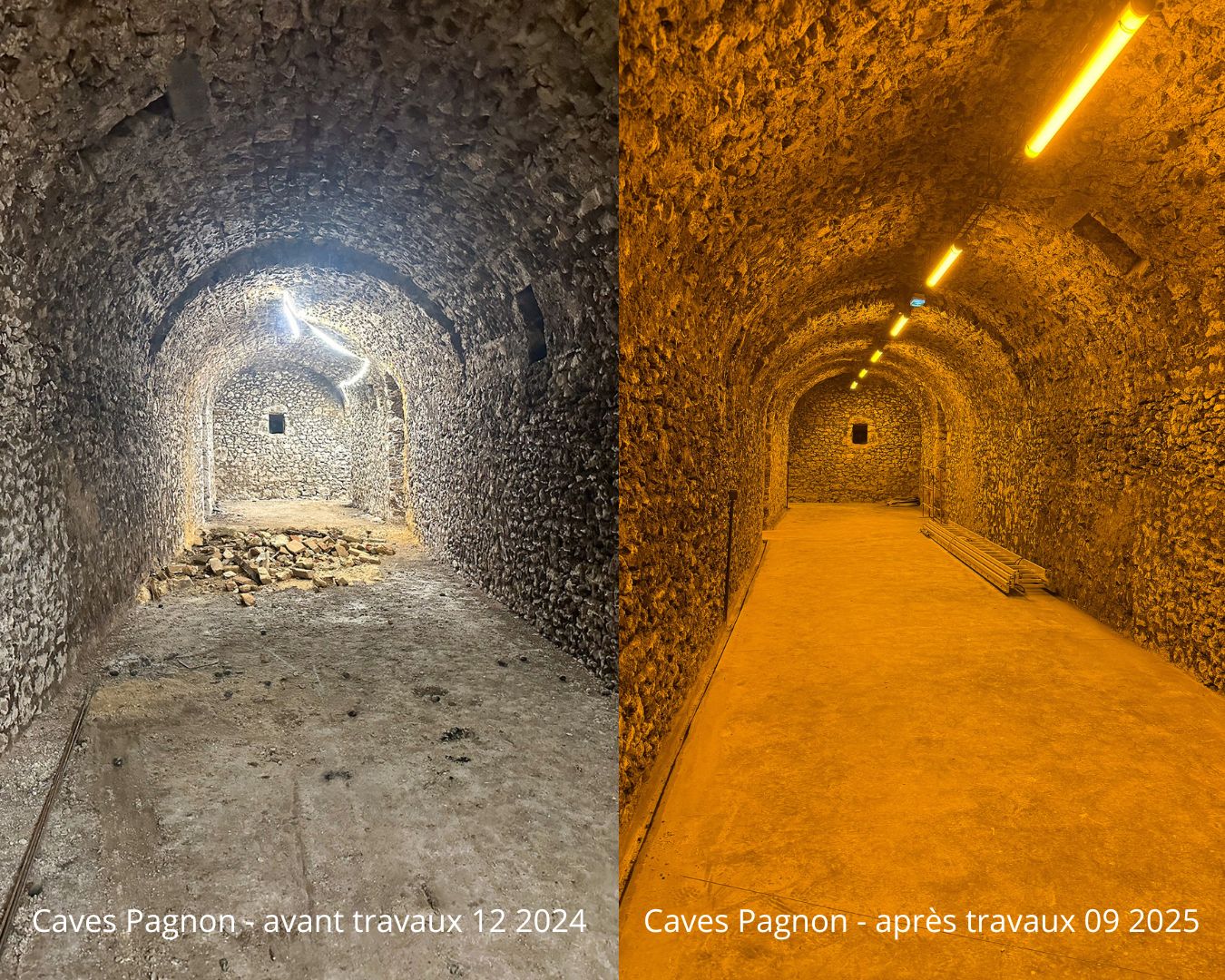 Mais très vite, le projet dépasse la simple opération immobilière. Lors des premières explorations, les équipes découvrent des caves d’une ampleur inattendue, demeurées intactes depuis leur abandon.  Une véritable capsule temporelle, creusée sous le village, qui les projette cent ans en arrière. Bouteilles encore étiquetées, flacons sur pointe, bouchons anciens, paillons, tout est resté en place. Au plafond, des numéros dessinent l’organisation des caves, entre les niveaux, de larges ouvertures servaient à faire circuler les bouteilles. On s’attend presque à voir revenir un chef de caves, en retard d’un siècle !