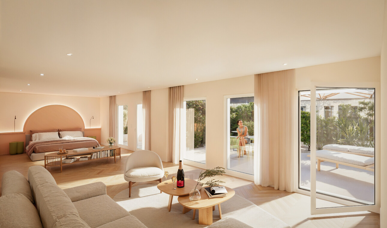 À l’étage se trouve l’hôtel qui vise les cinq étoiles. Dix des douze chambres donnent sur la cour intérieure du cloître aménagé en jardin, grâce à quoi, alors même qu’on se trouve dans le quartier le plus animé de Reims, le calme est absolu. Les plus petites font 22 m² et la suite la plus grande 60 m² avec une terrasse de 40 m².