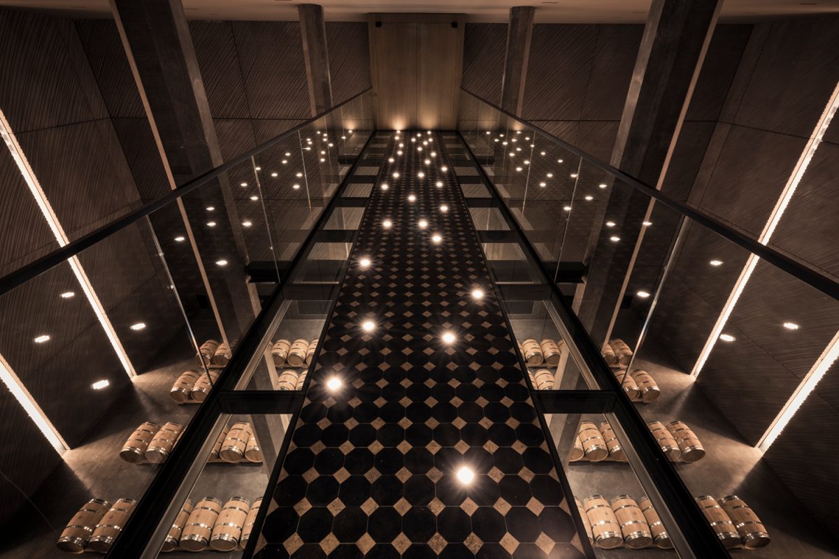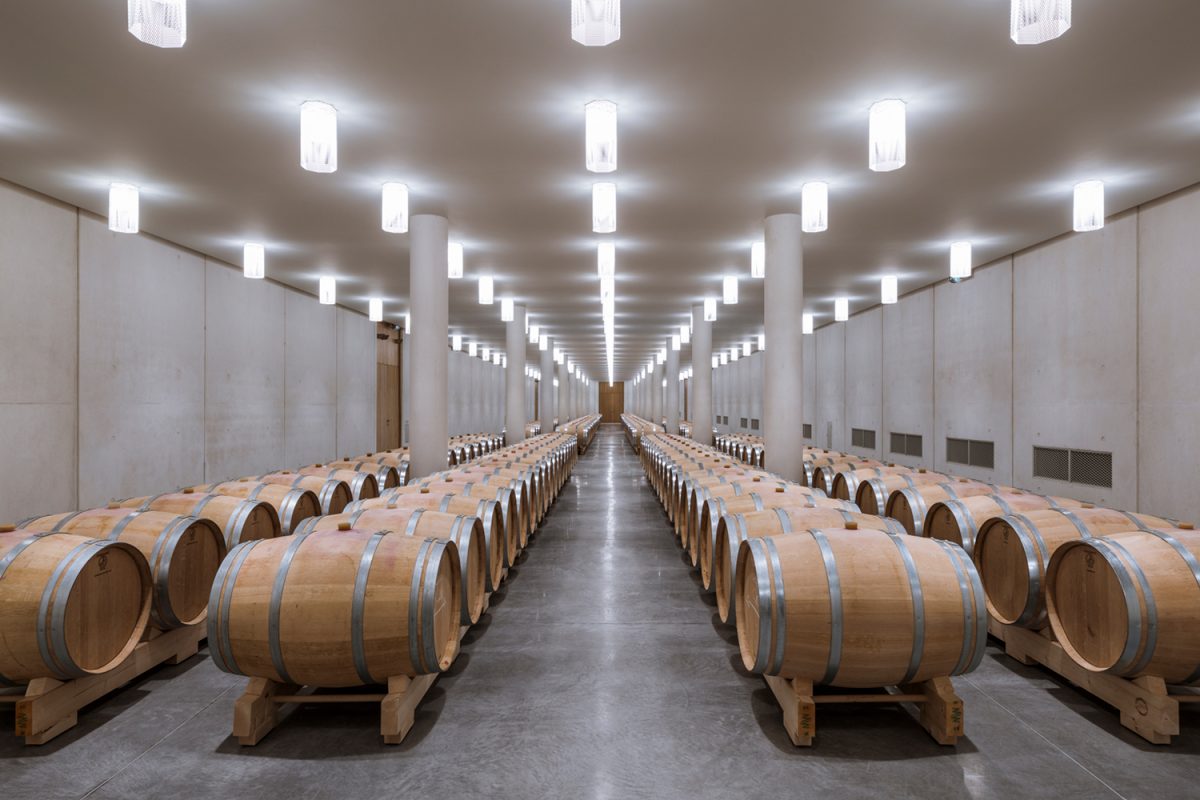 Un sas à double porte battante s’ouvre sur une passerelle, surplombant un chai à barriques gaîné de béton sombre. Suspendu à neuf mètres de hauteur, le visiteur se retrouve d’emblée projeté dans une cathédrale du vin, qui n’est pas sans évoquer l’église monolithe de Saint-Émilion. L’effet est saisissant, comme à peu près tout ce qui a été fignolé ici dans le plus grand secret, depuis le premier coup de pioche en 2017. Quatre ans de travaux : ce n’est plus un chantier, c’est une odyssée, à la hauteur des ambitions affichées par le groupe de réassurance SCOR depuis son rachat du Premier Grand Cru Classé. Troplong Mondot veut s’imposer pour de bon parmi l’élite des grands vins de Bordeaux, et ces nouvelles installations techniques, loin de constituer un aboutissement, ouvrent un nouveau chapitre qui devrait voir la propriété continuer de progresser.