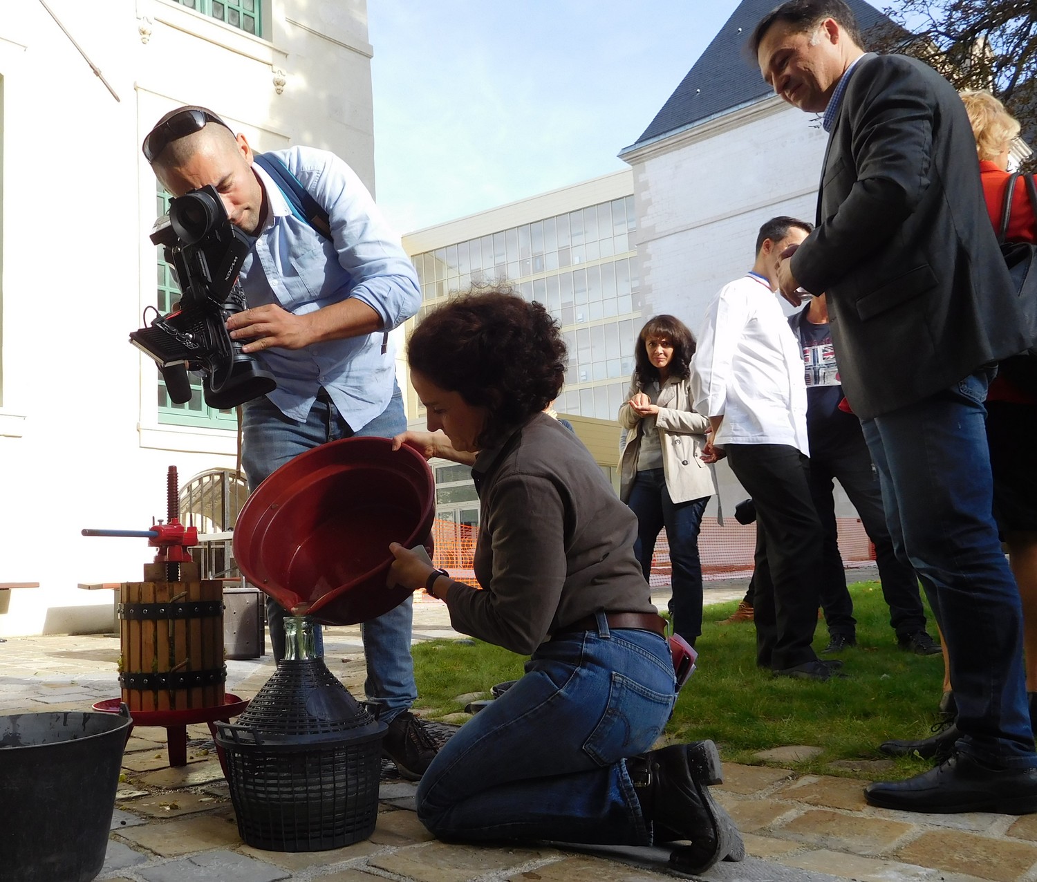 Moins d’une caisse de 50 kg vendangée ! On comptait plus de grappes que de journalistes, œnologues, élus et invités, jeudi 21 septembre à Reims, dans la belle cour de l’ancien collège des jésuites, aujourd’hui Sciences Po. Après deux ans de travaux et sans vendange possible, enfin, chacun célébrait le retour des sécateurs qui croquaient la perle blanche appelée verjus. Chacun goûtant aussi ce cépage très vert, sucré-acide, aux pépins assez gros, dont la chair rappelle le duo citron-ananas. Un raisin vendangé à 8,9 degrés d’alcool potentiel. Analyse en direct, gros avantage d’avoir des œnologues sur place !