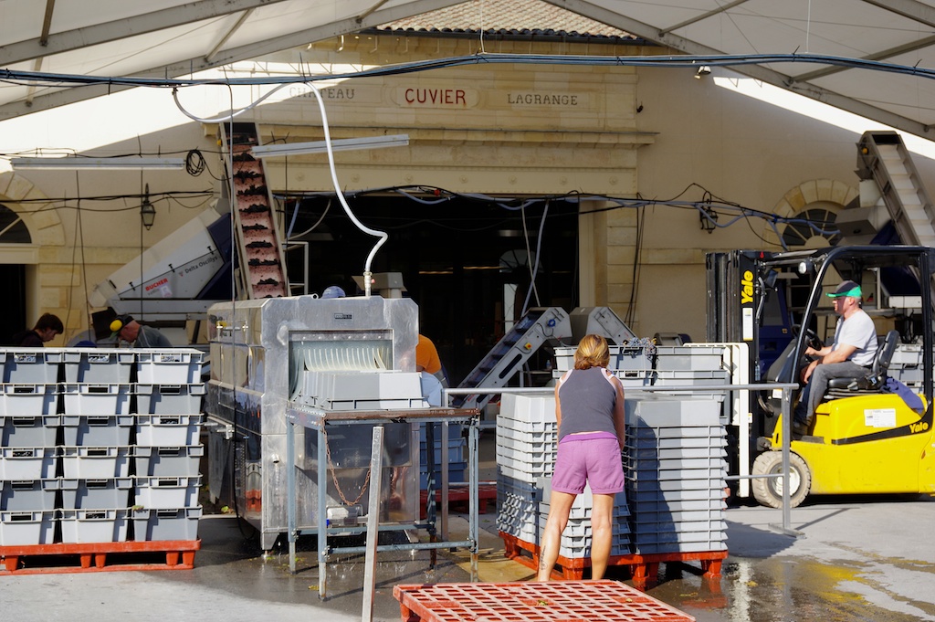 Effervescence dans les vignes du château Lagrange, 3ème Grand Cru Classé 1855 (Saint-Julien). Après les merlots, dont la récolte a commencé le 21 septembre, ce sont les cabernets qui sont vendangés depuis cette semaine. A en juger par les sourires de toute l’équipe, c’est un très beau millésime qui se prépare…