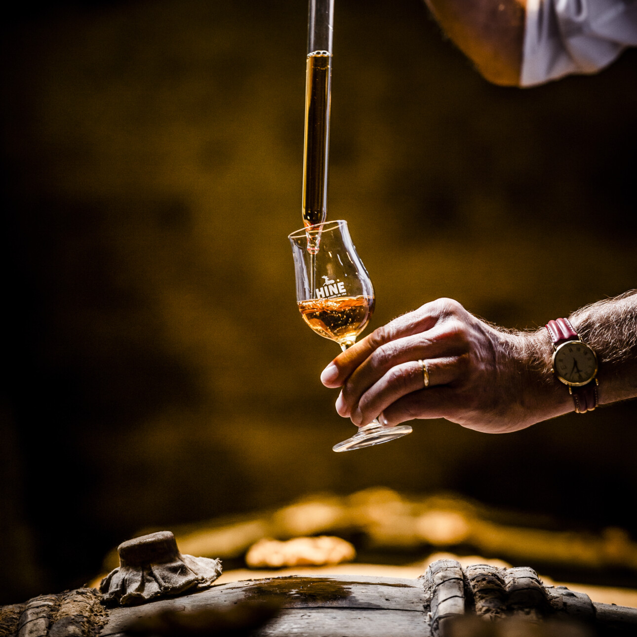 Cette carafe en porcelaine de Limoges renferme une année chaude mais pas caniculaire. Frais et orageux jusqu’au mois de juillet, le climat s’est rattrapé au mois d’août pour rééquilibrer et apporter des conditions idéales. « Ce qui a permis une maturation optimale des raisins et la création d’eaux-de-vie d’un rare équilibre, à la fois puissantes et élégamment aromatiques », souligne Paul Szersnovicz, successeur du maître de chai Éric Forget. Chez Hine, on aime les effets millésimes et ce 1975 est un exemple idoine de race et de concentration. Alors que l’ADN du cognac est l’assemblage pour proposer une constance dans la gamme par le jeu des proportions, quelques maisons misent sur le millésimé. Hine en tête, et cette Grande Champagne 1975 est restée en fûts de grains fins un demi-siècle pour atteindre son plus grand potentiel désormais. L’eau-de-vie fut légèrement descendue à 47 degrés d’alcool. « Nous avons fait plusieurs essais et ce niveau de degré lui confère le meilleur équilibre. C’est un 100 % ugni blanc, un vin qui fut distillé avec les lies, un cognac vieilli dans un fût de 350 litres », résume le jeune maître de chai.