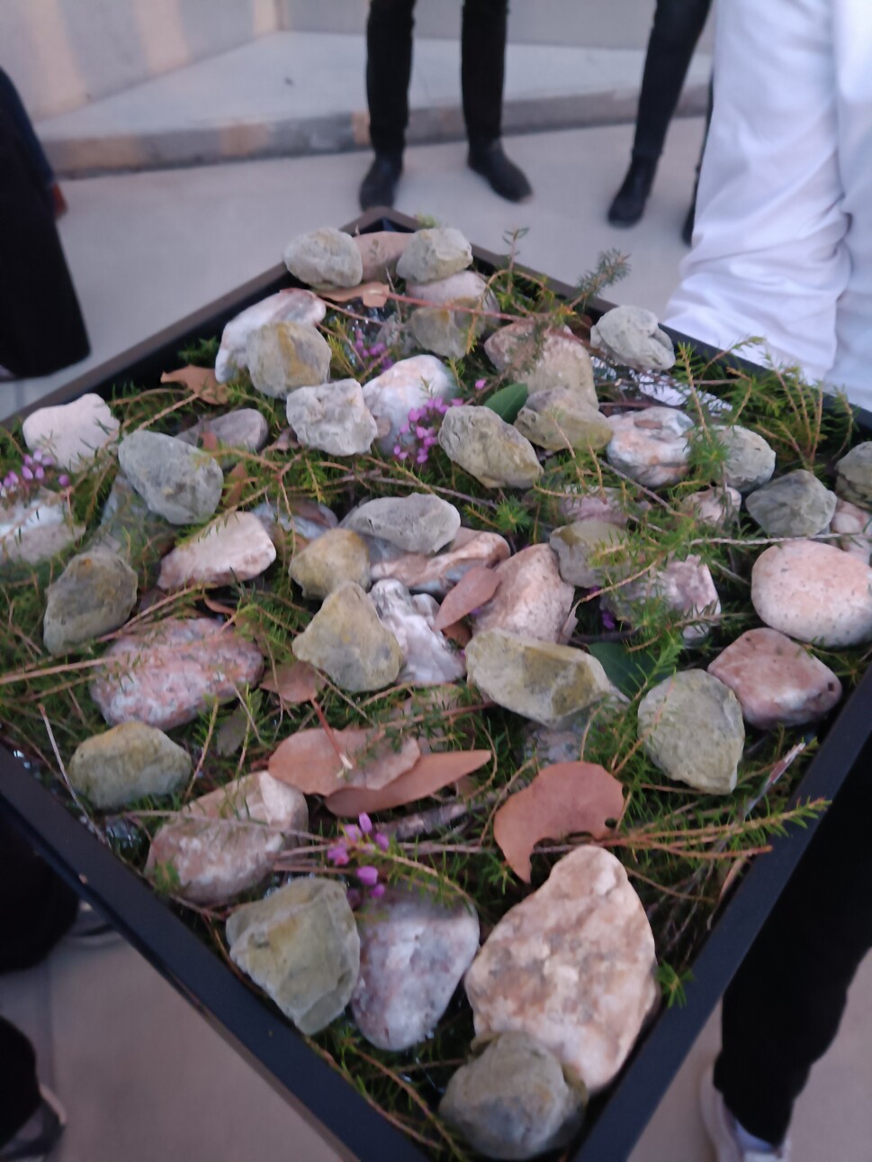 On hésite tant l’apparence est trompeuse, à croquer dans ce rocher. La bouchée apéritive, faite de fromage de chèvre, carotte et curcuma, véritable trompe-l'œil, est servie glacée et mêlée à de vraies pierres. Les dents saisissent une saveur délicate qui se fige pour mieux l’apprécier. Sarrasin torréfié et rutabaga s’unissent en tartelette, les champignons au coulis de myrtilles, avec la cuvée Grand Aven blanc des Vignerons Ardéchois le combo est parfait.