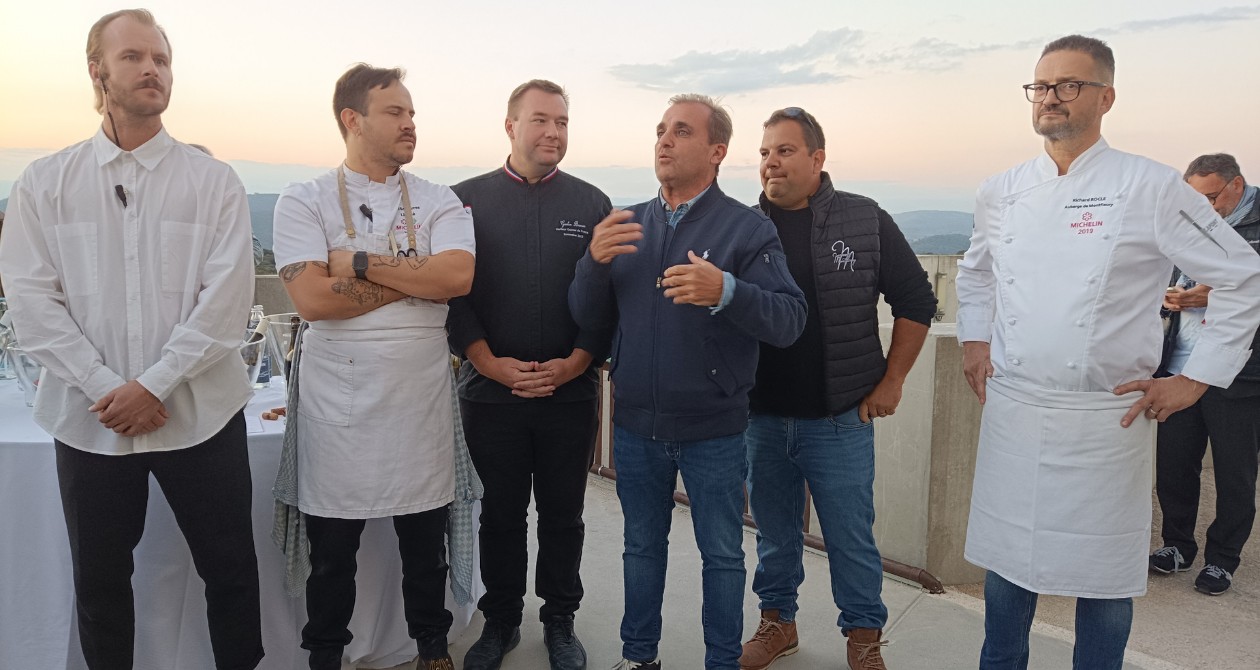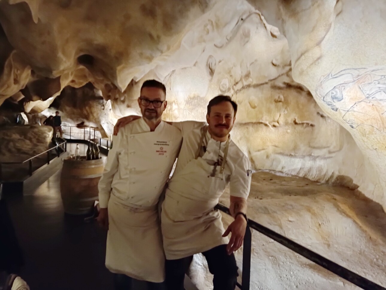 Richard Roque, de l’Auberge de Montfleury et Guido Niño Torres de Likoké ont élaboré un menu aussi brillant que leurs étoiles respectives. Inspiré par le lieu et l’époque des chasseurs-cueilleurs, premier mode de subsistance de nos ancêtres du Paléolithique, ils ont exploité les ressources du territoire et du terroir. Comme Gaétan Bouvier, sommelier Meilleur Ouvrier de France, qui a sélectionné les vins du département. Une immersion dans les strates géologiques et les microclimats des Côtes du Rhône, Côtes du Rhône Villages Saint-Andéol, IGP Ardèche et Côtes du Vivarais, des producteurs, négociants, coopératives et de l’union des Vignerons Ardéchois.