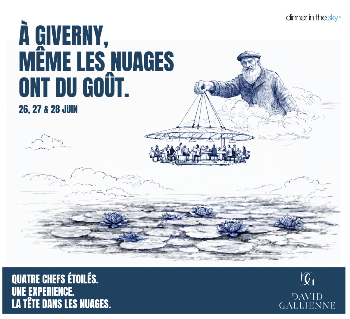 David Gallienne célèbre le centenaire de la disparition de Claude Monet... À l’occasion du centenaire de la disparition de Claude Monet, le chef étoilé David Gallienne s’associe à Dinner in the Sky pour offrir une expérience culinaire unique, suspendue à 50 mètres du sol. Les 26, 27 et 28 juin 2026, les convives pourront vivre des moments d’exception, entre émotion, élégance et sensations, face aux paysages qui ont tant inspiré le maître impressionniste. Chaque menu en trois temps sera imaginé à quatre mains : le vendredi avec le chef Cyril Boulais (restaurant étoilé Le Jardin des Plumes), le samedi avec le chef étoilé Alan Geaam (restaurant Alan Geaam, 1 étoile Michelin) et le dimanche avec le chef étoilé Charles Coulombeau (restaurants La Maison dans le Parc, 1 étoile Michelin, et Yozora, 1 étoile Michelin). Deux sessions seront proposées chaque jour, au déjeuner et au dîner, le vendredi, le samedi comme le dimanche, offrant aux convives plusieurs occasions de vivre cette expérience hors du commun. Les assiettes, pensées comme de véritables tableaux, dialogueront avec le paysage et les émotions, mêlant lumière, couleurs et saveurs. Pour célébrer cet anniversaire historique, l’artiste contemporain Saype réalisera durant 15 jours une œuvre éphémère, visible uniquement depuis les airs. Les participants auront ainsi une perspective inédite sur cette fresque poétique et engagée. Des montées en après-midi seront également proposées pour permettre au public de découvrir l’œuvre dans des conditions privilégiées, hors du cadre des repas. Cette parenthèse suspendue au-dessus de Giverny promet une immersion totale où art et gastronomie se rencontrent dans un dialogue spectaculaire entre ciel et terre. LE CHEF DAVID GALIENNE Sacré gagnant de Top Chef en 2020, David Gallienne, chef étoilé au Guide Michelin, s’impose comme un cuisinier audacieux qui sublime les produits locaux avec une approche à la fois contemporaine et respectueuse des traditions.