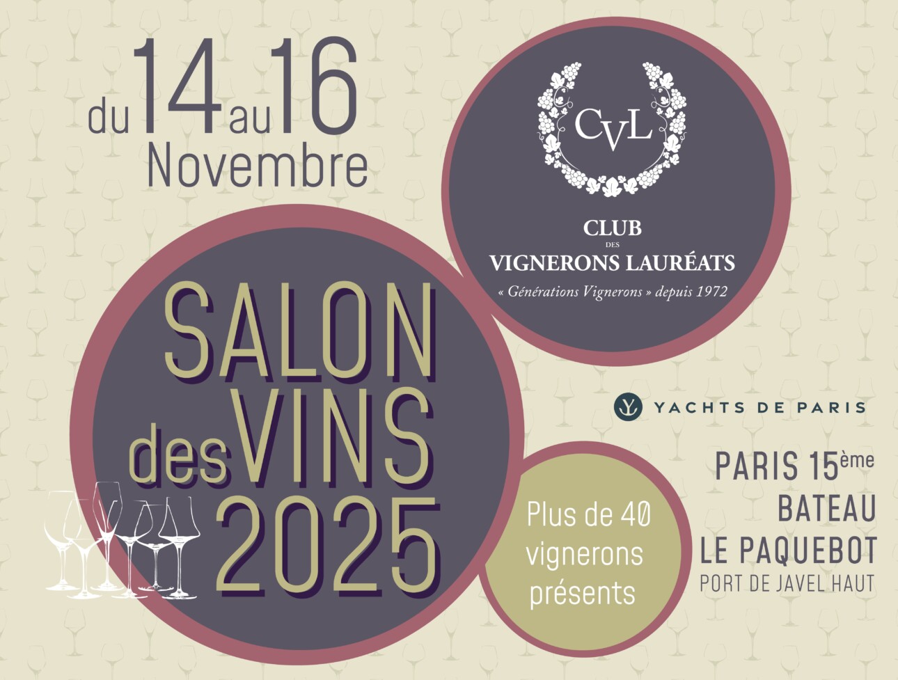 Le Club des Vignerons des Lauréats est une association de vignerons créée en 1972 pour faire connaître leurs vins au grand public. Notre salon des vins de Paris existe depuis 50 ans. En 2025, vous dégusterez gratuitement et pourrez acheter à des prix préférentiels les vins d’une quarantaine de vignerons de toute la France : Languedoc-Roussillon, Cognac, Sud-Ouest, Provence, Corse, Champagne, Alsace, Jura, Savoie, Bourgogne, Val de Loire, Bordeaux, Côtes du Rhône ainsi que les spécialités du Sud Ouest des Délices d’Amélie (foie gras, confits, magrets…). Horaires : Vendredi 14 novembre : 14h – 21h Samedi 15 novembre : 10h – 20h Dimanche 16 novembre : 10h – 17h Un lieu convivial et chaleureux : Bateau Le Paquebot, Port de Javel Haut - Paris XV Informations à retenir : - Entrée GRATUITE, inscription obligatoire - Restauration sur place - Service de drive - Service de livraison - Parking gratuit à proximité - 5€ le verre de dégustation Restauration sur place : huîtres, coquilles Saint-Jacques, assiettes de canard … Un service de livraison des vins à domicile sera disponible (tarifs disponibles sur notre site internet). Un service de Drive Minute vous sera aussi proposé pour emporter tous les vins achetés sur le quai, à l'issue de votre visite ou plus tard dans le weekend sur rdv. Parking à proximité : Parking Beaugrenelle, 5 quai Andre Citroen - Paris XV Inscription gratuite mais obligatoire, pour en savoir plus : https://www.club-vignerons-laureats.com/salon-des-vins-paris/ Lien inscription : https://www.helloasso.com/associations/club-des-vignerons-laureats/evenements/salon-des-vins-paris-2025-club-des-vignerons-laureats