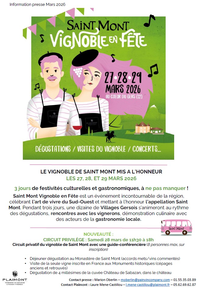 Du 27 au 29 mars 2026, le vignoble de Saint Mont sera à l’honneur à l’occasion de Saint Mont Vignoble en Fête, un rendez-vous incontournable du Sud-Ouest, où la cave coopérative Plaimont invite à explorer ses vignobles.