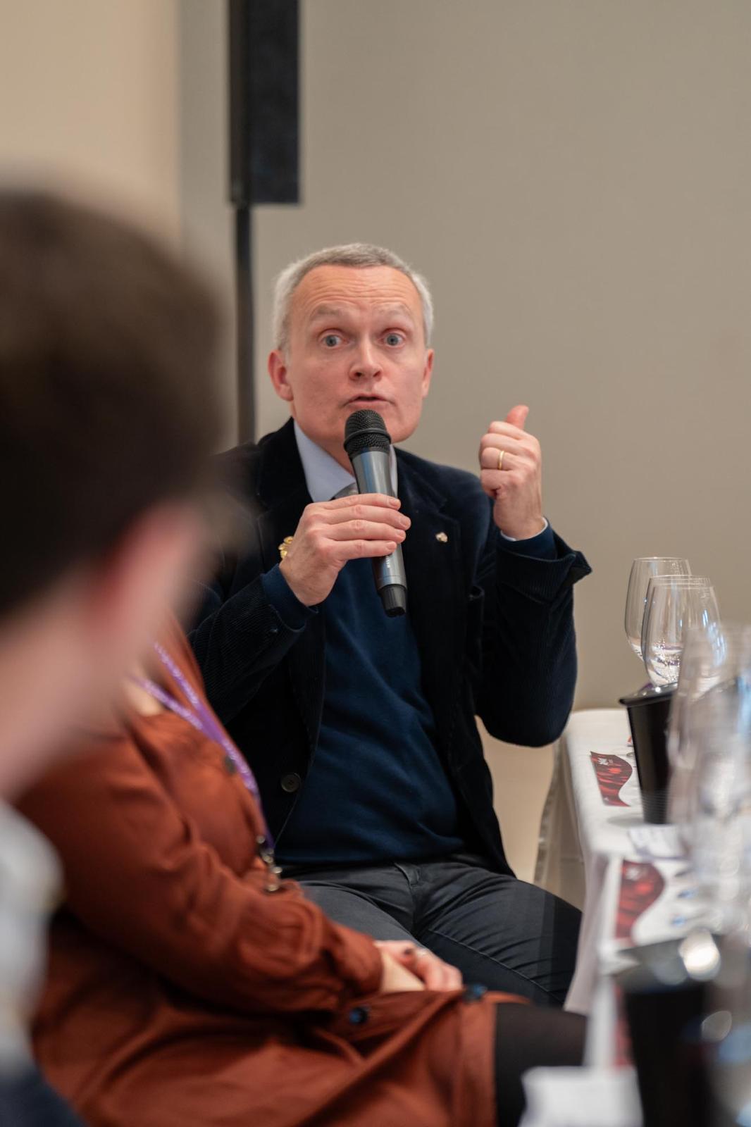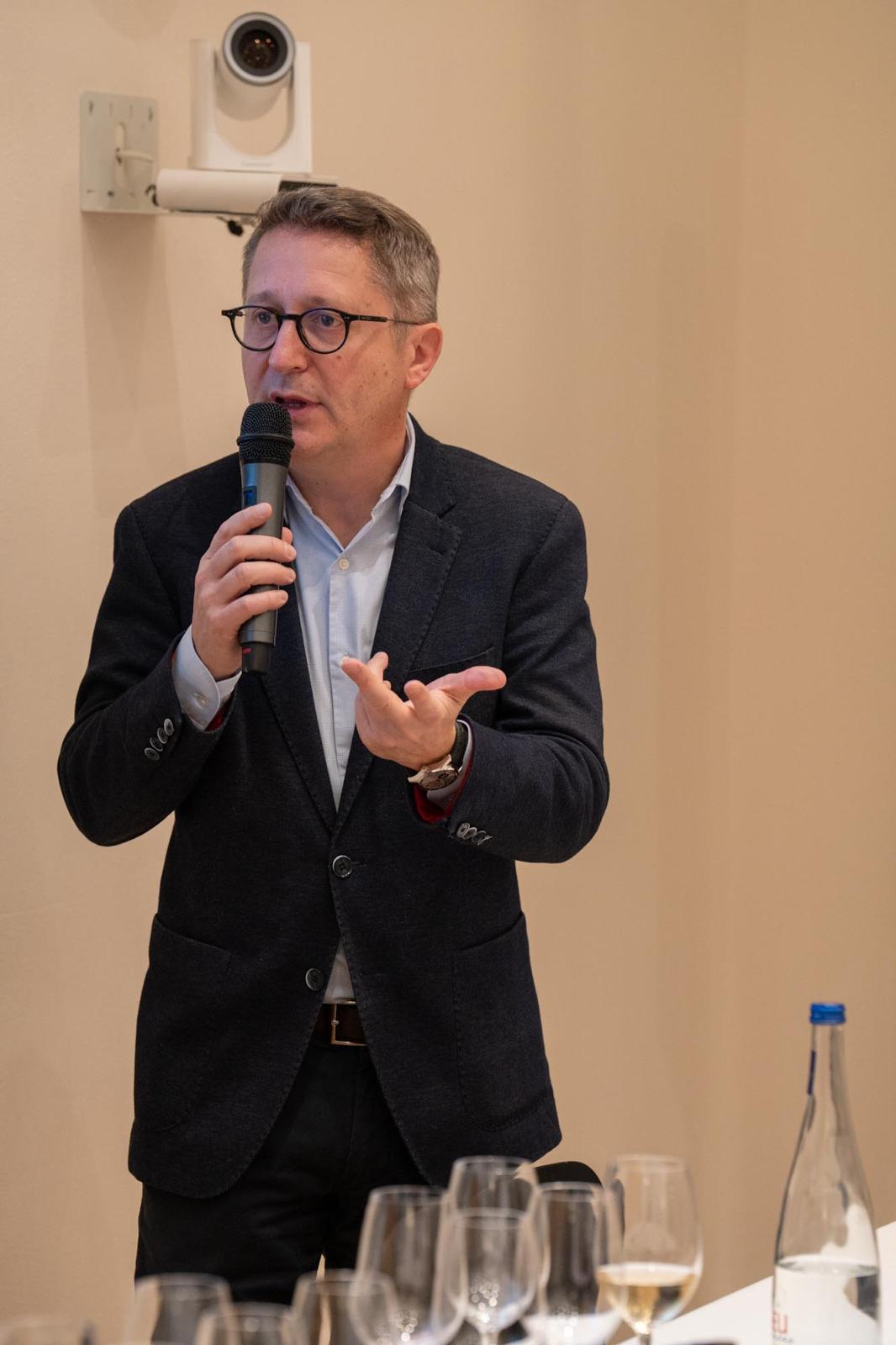 Guillaume Deglise était tout sauf dépaysé dans les entrailles du Palais de la Bourse. Celui qui dirige la Maison Henriot depuis 2024 a dirigé le salon Vinexpo à Bordeaux entre 2013 et 2018 puis a été le directeur international des vignobles Domaines Barons de Rothschild (Lafite) jusqu'à son arrivée en Champagne, et vit toujours dans la capitale girondine. C'est donc en toute décontraction, mais avec une remarquable pédagogie, qu'il a pu conter l'histoire des cinq cuvées présentées par la Maison durant une heure. La première ? La cuvée Brut Souverain, « le parfait reflet de la Maison » dixit Guillaume Deglise, puisqu'il assemble l'intégralité des 29 crus que l'on retrouve dans les vins de la Maison. Ce parfait « vin d'apéritif » a laissé place au Blanc Souverain, le blanc de blancs historique d'Henriot – que la Maison produit depuis 1880 – qui a retrouvé son nom historique avec l'arrivée de Guillaume Deglise.