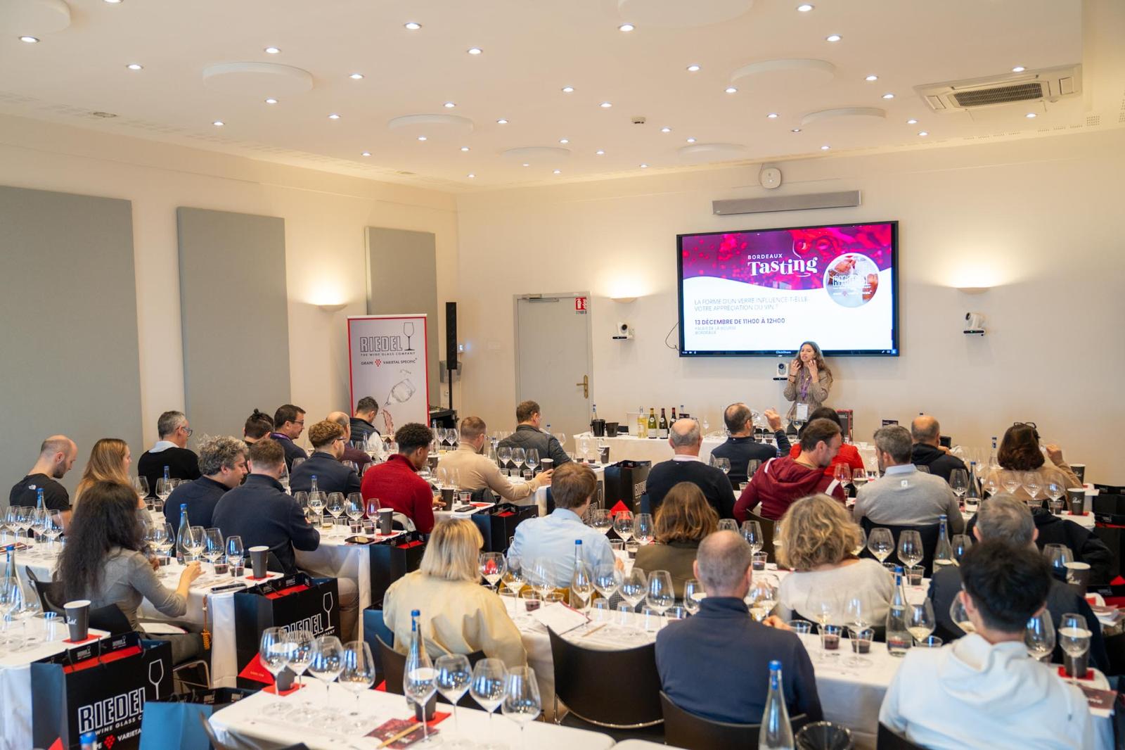 Bien connue des habitués de Bordeaux Tasting, la master class de la célèbre cristallerie autrichienne a encore une fois ravi l'auditoire. Son but ? Démontrer que le verre est aussi important que le vin lors de la dégustation, et que sa forme peut considérablement affecter la dégustation du nectar qu'elle contient. « On se plaint toujours du vin, mais jamais du verre », lance d'entrée Sophia Anselme, responsable Marketing & Opérations chez Riedel. Pour mettre en exergue, quatre vins et autant de verres de la collection Veloce (riesling, chardonnay, pinot noir et cabernet/merlot) étaient mis à l'épreuve.