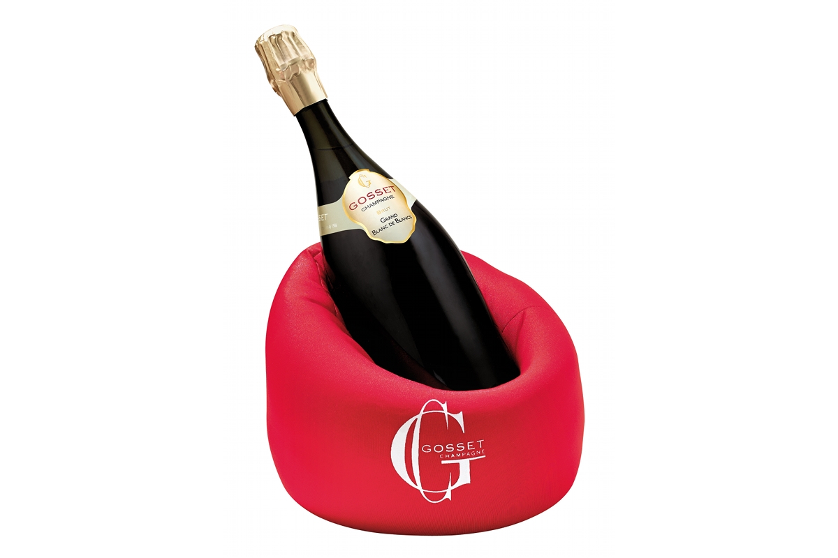 Gosset propose le pochon Soft Pouch, une sorte de pouf qui permet non seulement de poser et caler la bouteille, mais aussi de la conserver au frais par ses petites billes isolantes. Idéal pour une table d’été, un pique-nique sur l’herbe ou sur le sable, il peut ensuite être réutilisé comme support de livre, coussin, etc. 54 € avec une bouteille de Gosset Grand Rosé ou Grand Blanc de blancs.