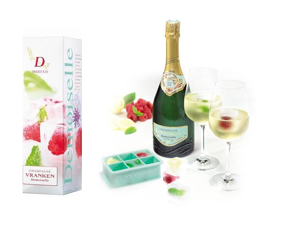 Innovation avec cette cuvée Demoiselle E.O. Sweet au dosage rond et doux qui se consomme avec un ou plusieurs glaçons « gourmands » (myrtille, zeste d’agrume, framboise, feuille de menthe, etc. emprisonnés dans la glace, qui se libèrent en fondant). En cadeau dans l’étui, un moule permet d’élaborer ses propres glaçons. 35 €.