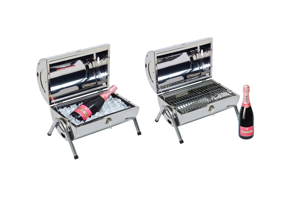 C’est un étonnant objet qu’a développé Piper-Heidsieck, puisqu’une fois ouvert il peut être rempli de glace pour rafraîchir la bouteille ou au contraire accueillir des grilles et se transformer en un barbecue aussi qualitatif qu’esthétique pour un pique-nique à deux. Il trouve sa résonance dans la célèbre cuvée Rosé Sauvage, un champagne rosé à la couleur soutenue et à la forte personnalité (fruits rouges juteux, notes épicées et fumées) qui accepte volontiers d’être servi sur une viande rouge grillée (agneau, bœuf, magret de canard) ou des poissons comme le thon ou le saumon. 31 €.