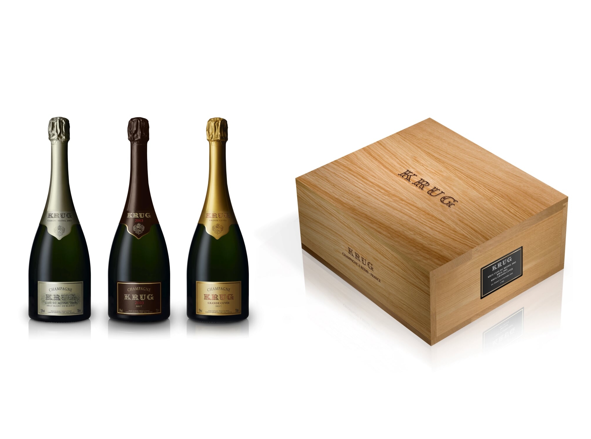 Pour la fin d’année, Krug joue une carte originale, une communication pour sa Grande Cuvée en association avec la « pomme de terre » du pâtissier Sébastien Gaudard. Un dessert étonnant qui sera servi en exclusivité au salon de thé des Tuileries du 15 au 31 décembre accompagné d’un verre de Krug (38€) ou deux desserts à emporter avec une demi-bouteille à 90€. La maison dévoile également pour la première fois une collection en caisse bois de trois expression de l’année 2003 : Clos du Mesnil, Krug et Grand Cuvée (990 €).